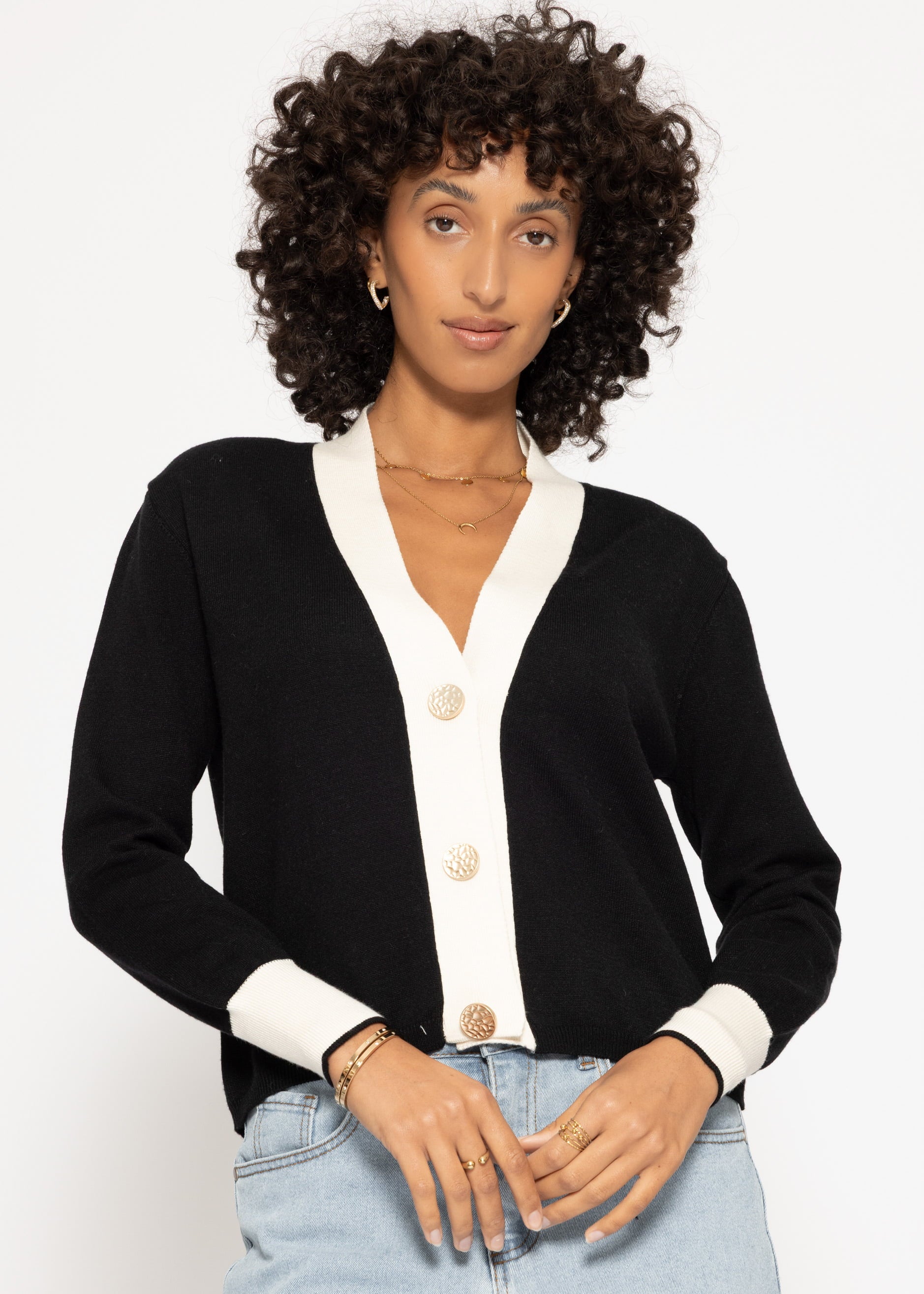 Dieser Cardigan ist ein echtes Must-have für jede Garderobe. Das Strickmaterial wird durch offwhite Abschlüsse an Kragen, Knopfleiste und Ärmelbündchen aufgelockert, was für einen stilvollen Look sorgt. Besonders edel wirken die goldfarbenen Knöpfe mit feiner Prägung, die dem Design eine raffinierte Note verleihen. Dank seines lockeren Schnitts und seiner weichen Haptik bietet der Cardigan einen hohen Tragekomfort und lässt sich vielseitig kombinieren – ob lässig zu Jeans für den Alltag oder elegant über einer Stoffhose oder einem Kleid.