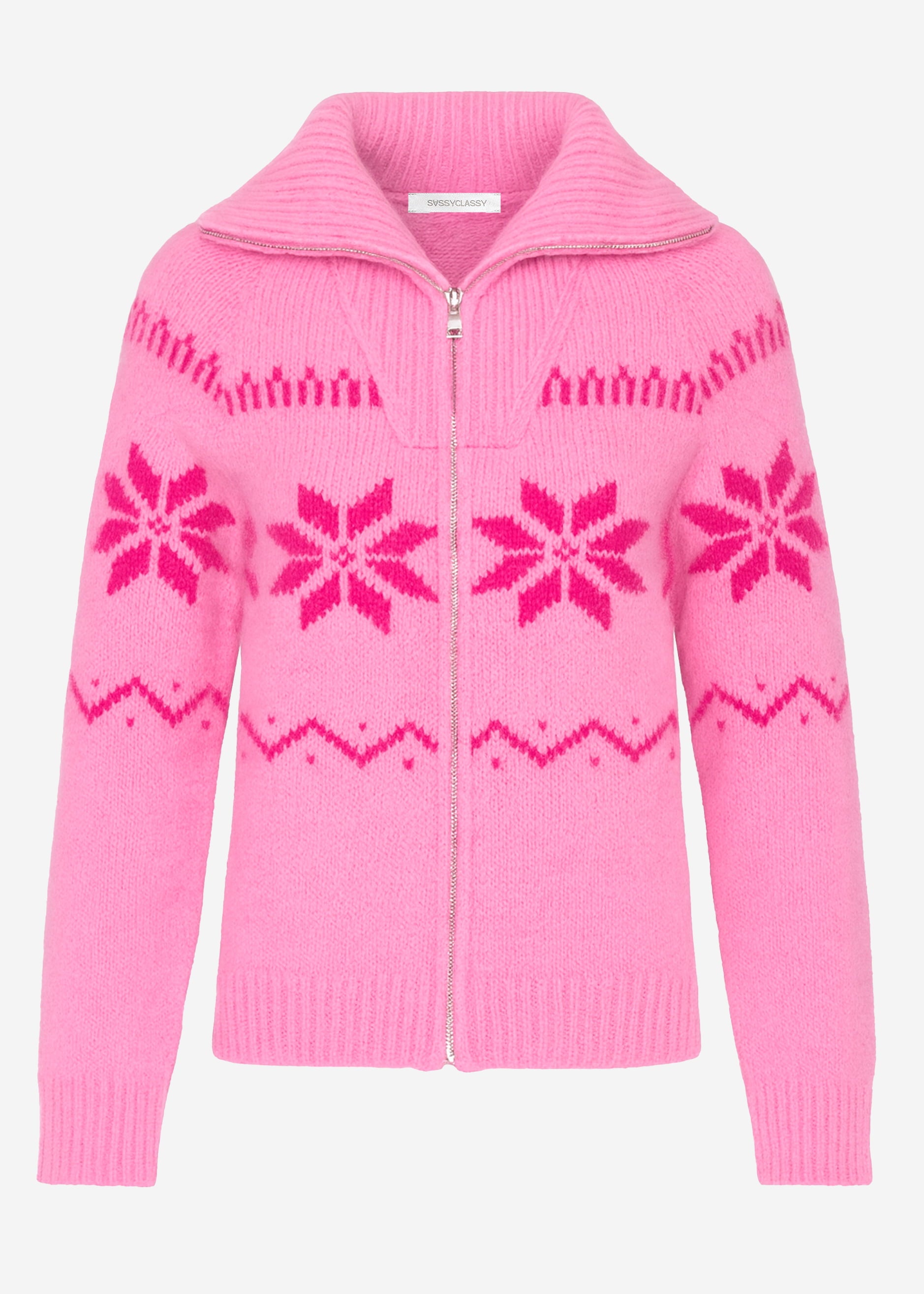 Pinkfarbener Strick-Cardigan mit kontrastierenden Norweger- und Schneeflockenmotiven. Weicher Grobstrick mit hohem Kragen, durchgehendem Reißverschluss und langen Ärmeln. Gerippte Abschlüsse runden den gemütlichen Look ab.