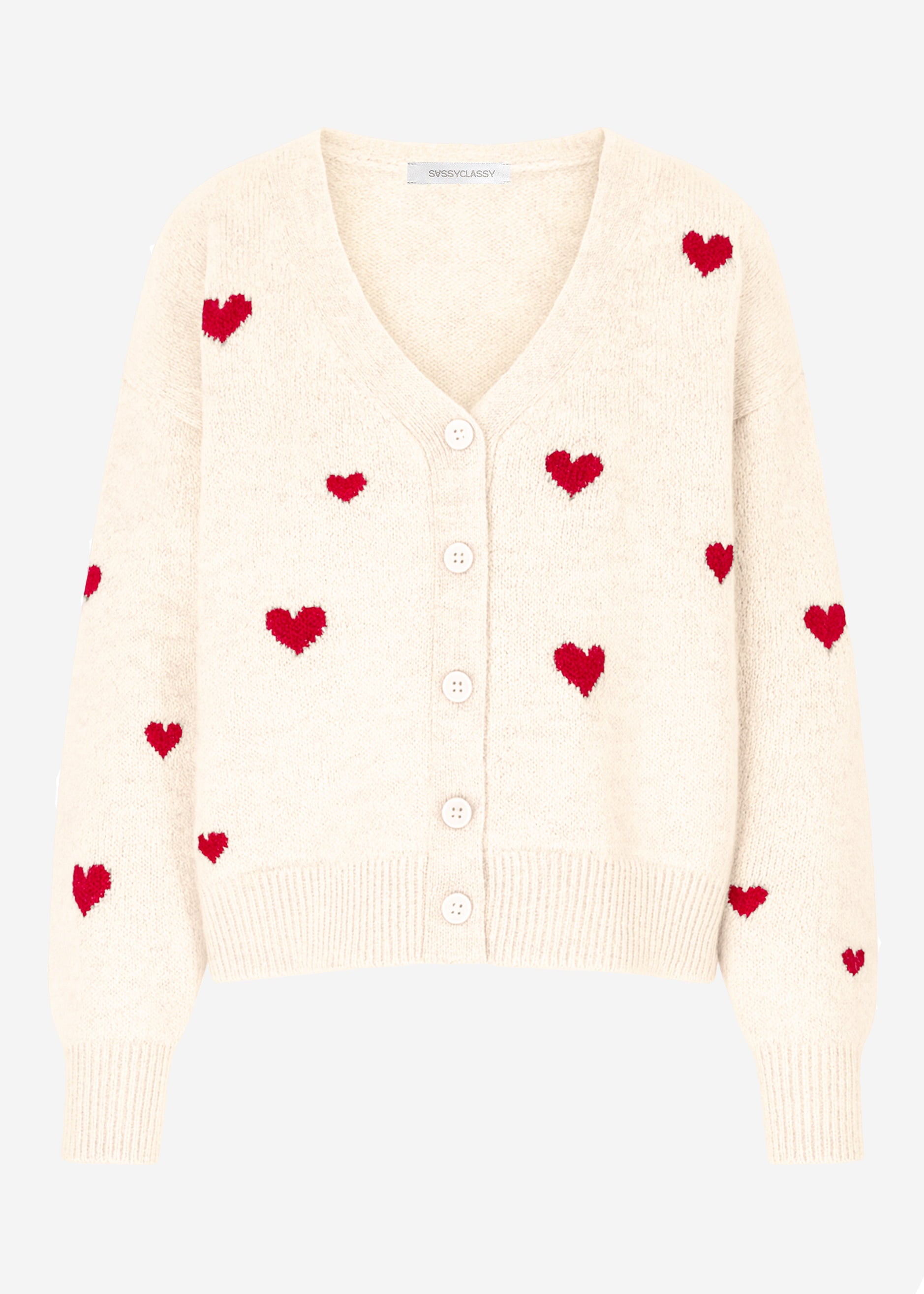 Dieser weiche Cardigan in Offwhite besticht durch rote Herz-Stickereien und bietet einen lockeren Schnitt mit überschnittenen Schultern. Das Design mit V-Ausschnitt und Knopfleiste verleiht dem Cardigan einen romantischen und modernen Look.