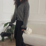 Dieser Cardigan überzeugt durch seine lässige Passform und den gemütlichen Strick. Die langen Ärmel mit Volants verleihen dem Modell eine feminine Note und eine leicht ballonartige Silhouette.