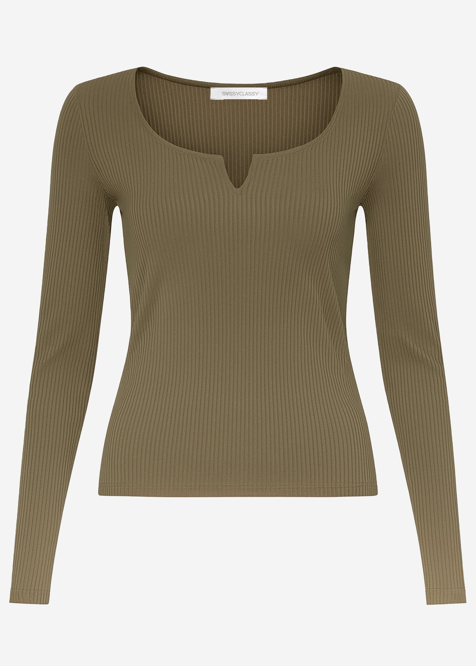 Dieses gerippte Langarmshirt aus elastischer Viskose bietet Qualität, Komfort und ein raffiniertes Design. Es verfügt über einen weiten Rundhalsausschnitt mit einem subtilen V-Detail und eine doppellagige Verarbeitung für Stabilität, Wärme und Komfort.