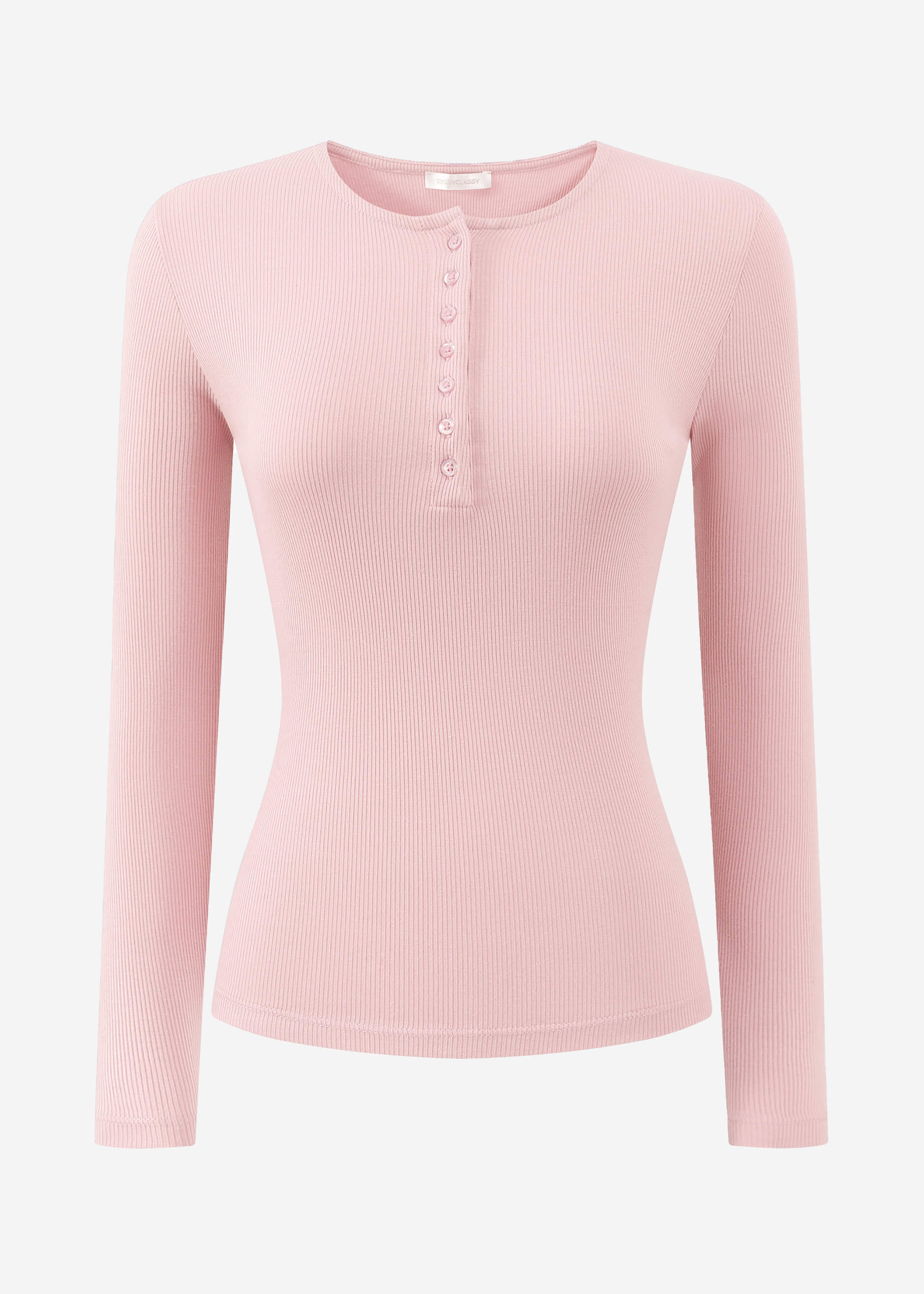 Geripptes Langarmshirt mit Knopfleiste - rosa