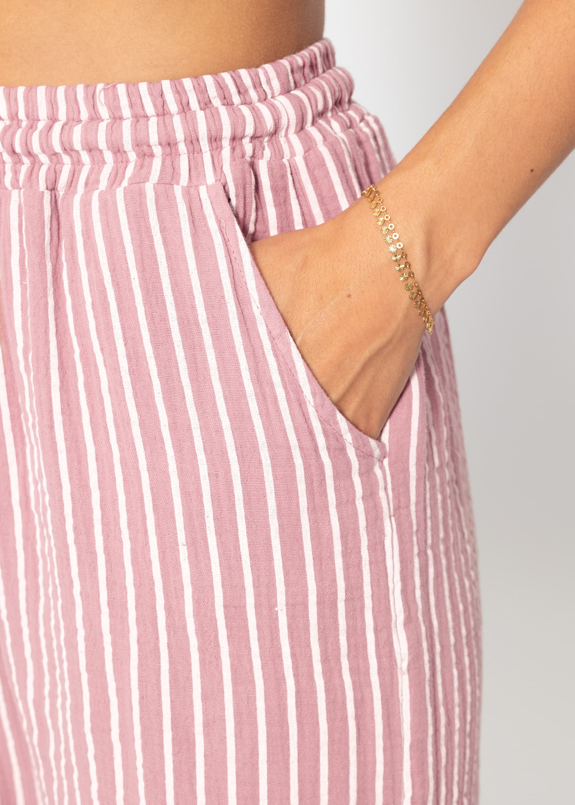 Diese Musselin Hose ist die ideale Wahl für entspannte Tage und lässige Outfits. Das Modell besitzt eine lockere Passform, einen hohen, elastischen Bund mit Bindeband für eine individuelle Anpassung. Seitliche Eingrifftaschen bieten Platz für kleine Alltagsgegenstände. Gefertigt aus reiner Baumwolle, bietet diese Hose mit weitem Bein optimalen Tragekomfort. Der Streifen Print verleiht der Hose den maritimen Look und macht sie zu einem echten Blickfang.