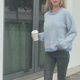 Dieser gestreifte Strickpullover in Hellblau bietet Komfort und Stil. Er ist aus weichem Material gefertigt und hat ein auffälliges Streifenmuster, einen weiten Rundhalsausschnitt sowie gerippte Bündchen.
