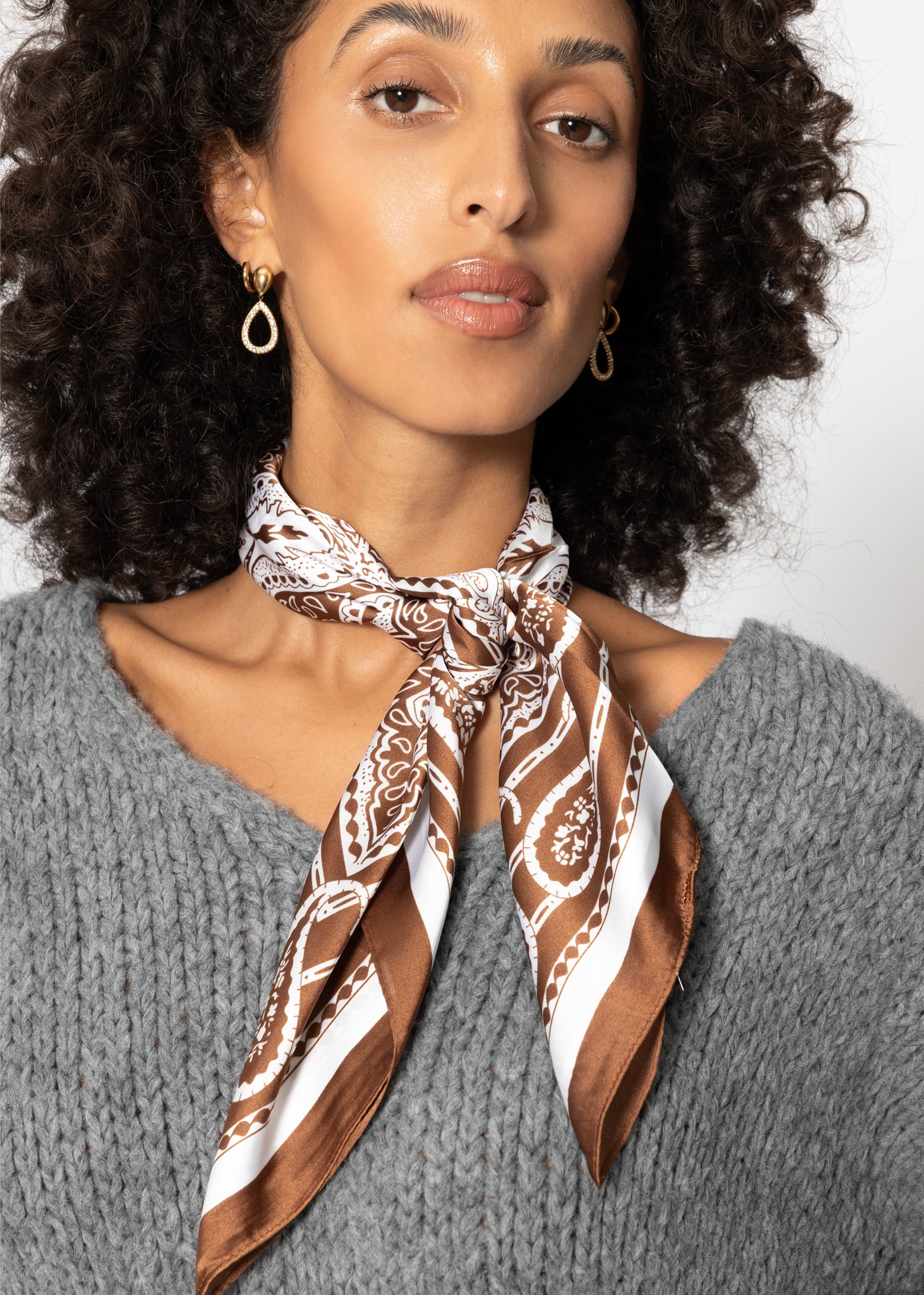 Dieses angesagte Halstuch bringt Eleganz in deinen Kleiderschrank. Der schöne Paisley Print verleiht jedem Outfit eine trendige Note, während das leichte, fließende Material für ein angenehmes Tragegefühl sorgt. Ob lässig um den Hals geschlungen, als modisches Haarband getragen oder dekorativ an der Handtasche befestigt - dieses Tuch ist der perfekte Begleiter für jede Gelegenheit.
