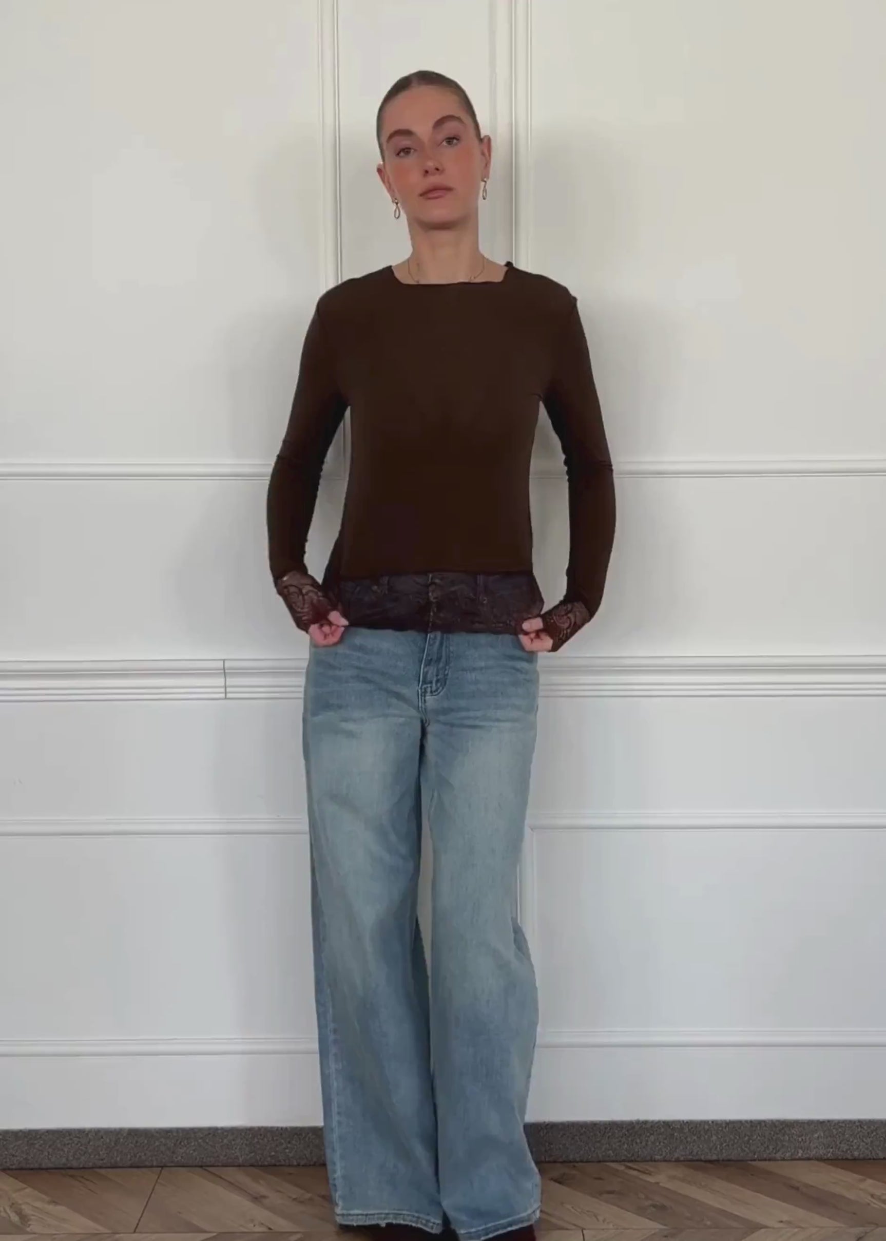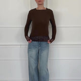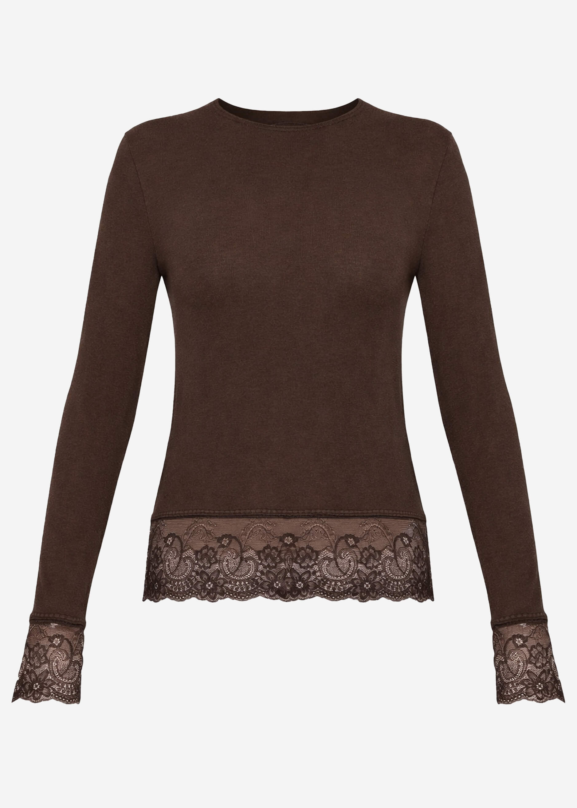 Langarmshirt in Braun mit dekorativer Spitzenborte am Saum und an den Ärmelabschlüssen. Schlichtes, körpernahes Design mit feinen Spitzen-Details für einen femininen Akzent. Angenehm weiches Material mit Kaschmiranteil für ein besonders komfortables Tragegefühl.