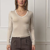 Beiges, weiches Langarmshirt mit V-Ausschnitt für einen femininen, zeitlosen Look. Ideal für elegante Alltags-Outfits oder als edles Basic zum Kombinieren.
