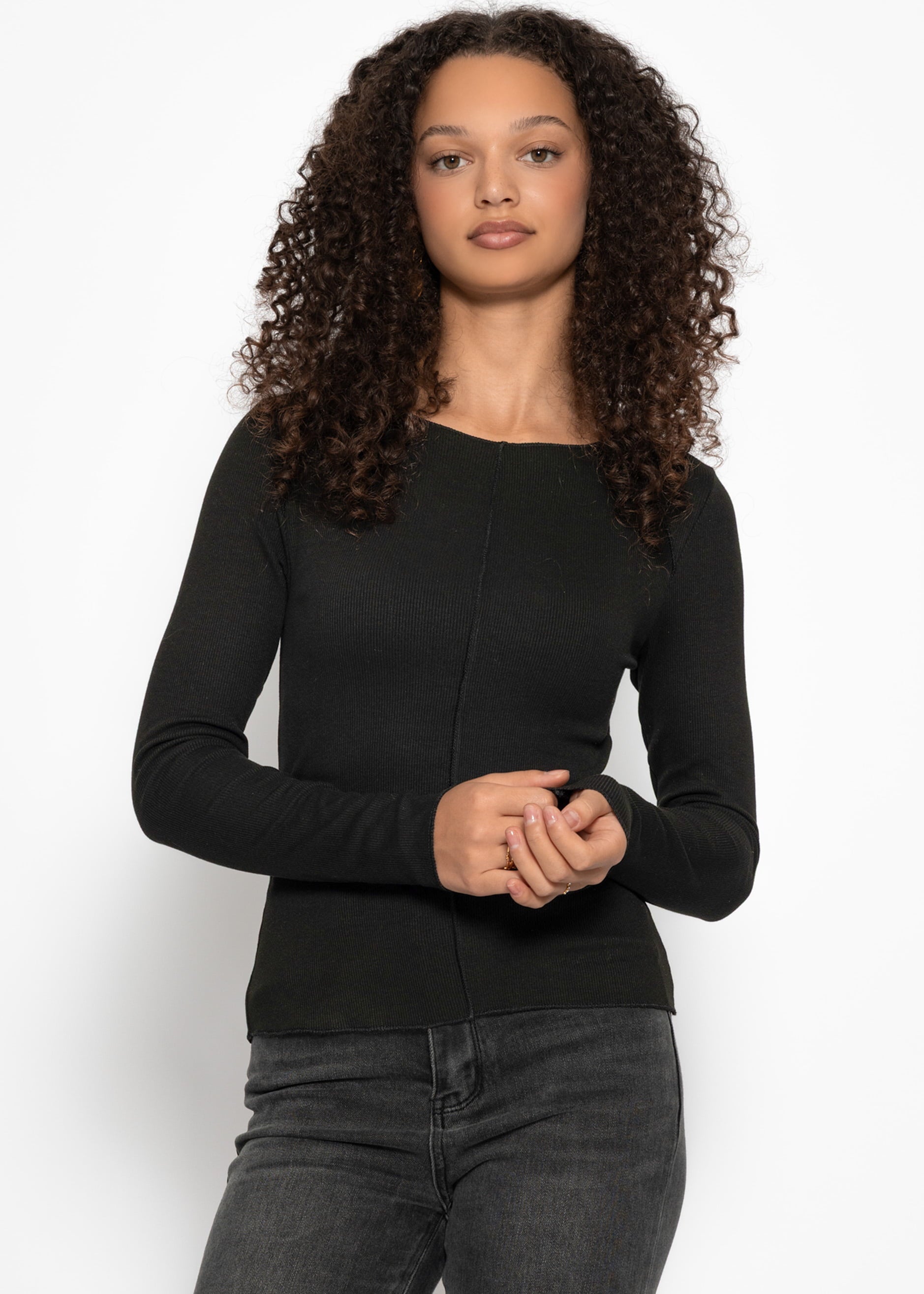 Schwarzes Langarmshirt mit dekorativen Ziernähten. Schmal geschnittenes Design aus weichem, fein geripptem Jersey mit Rundhalsausschnitt. Schlichtes Basic für vielseitige Kombinationen.