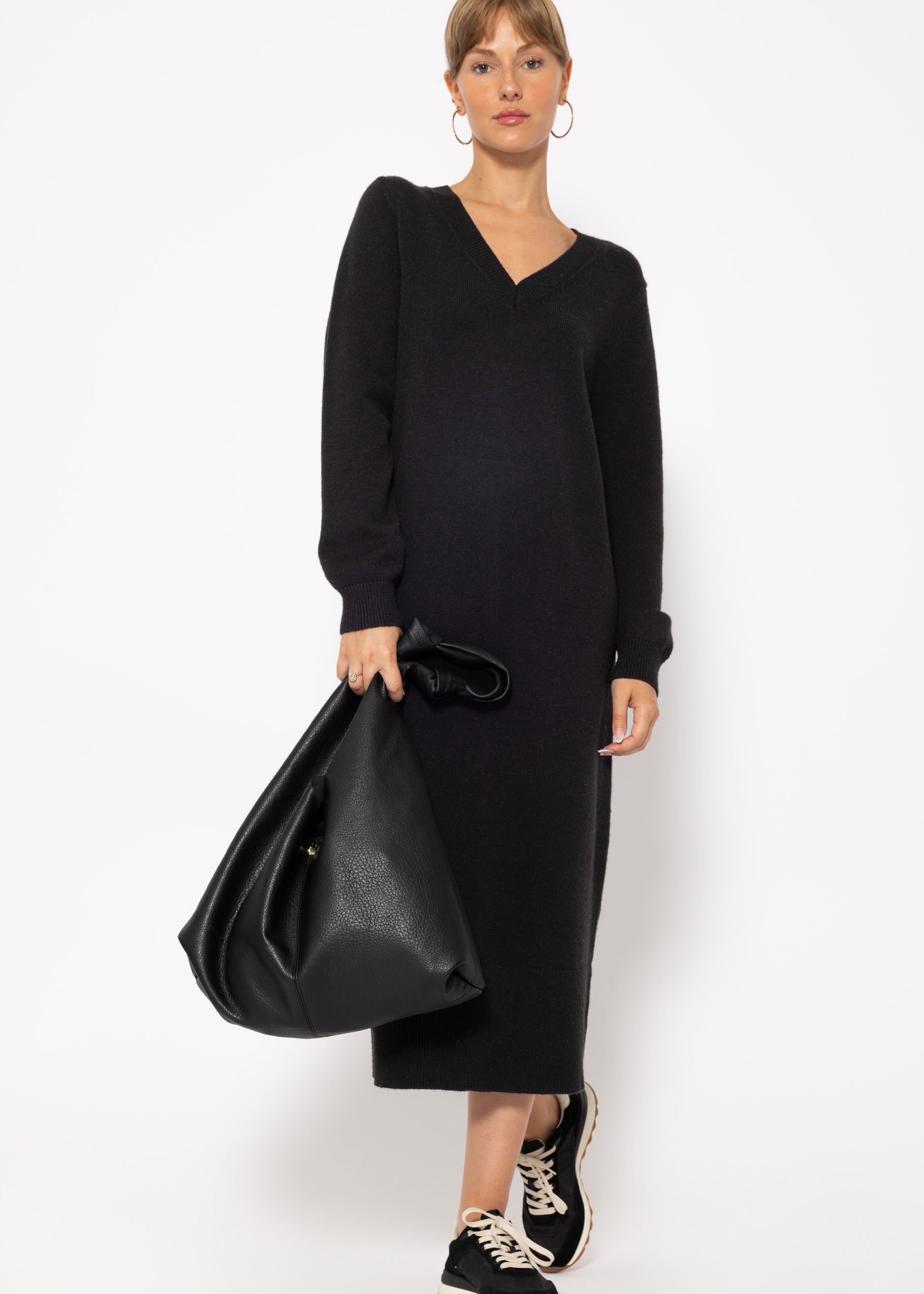 Langes Strickkleid mit V-Ausschnitt - schwarz