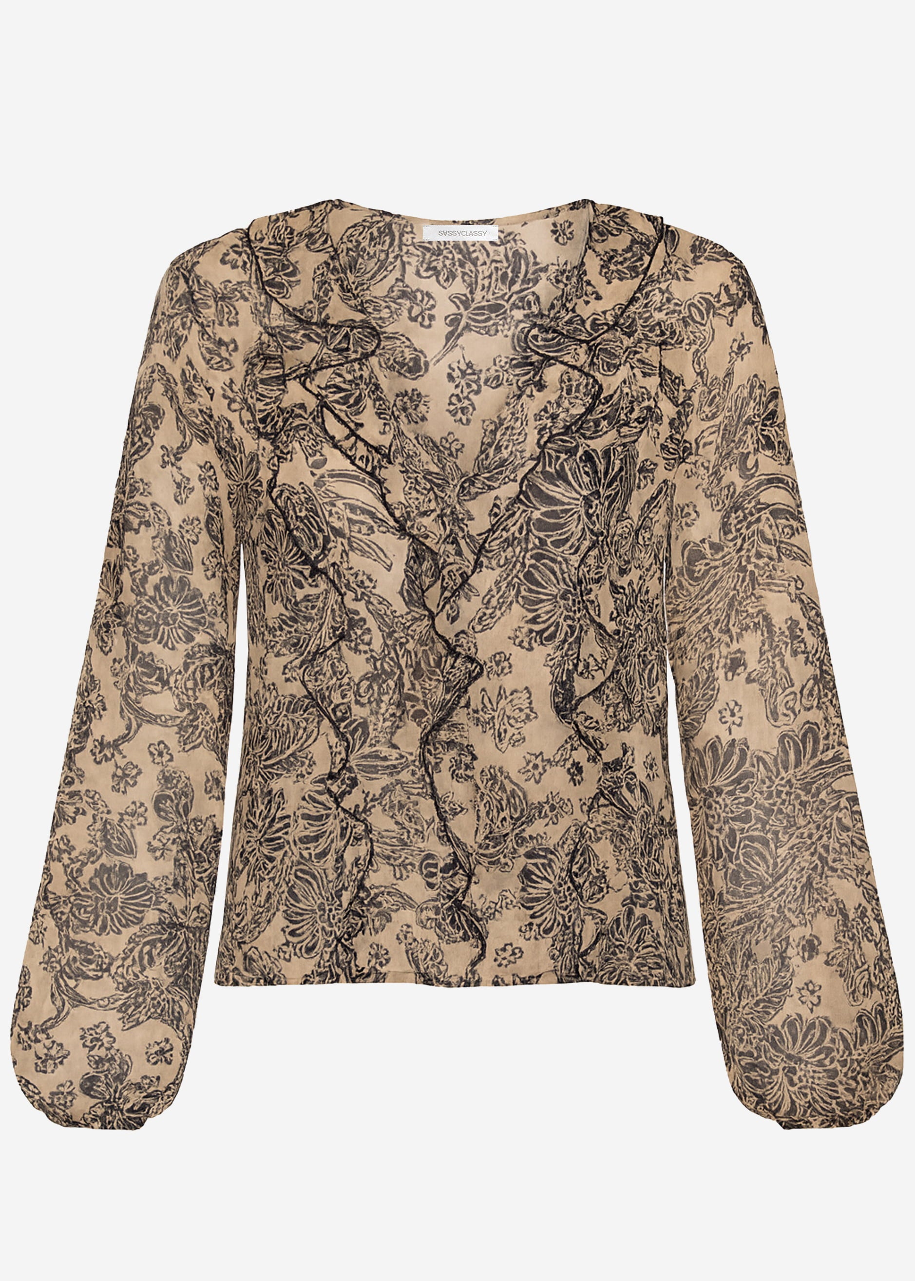 Diese Chiffon Bluse in Beige zeichnet sich durch einen V-Ausschnitt mit Rüschen, längslaufende Rüschen und einen floralen Print aus. Sie besitzt lange weite Ärmel mit Gummizugabschluss.