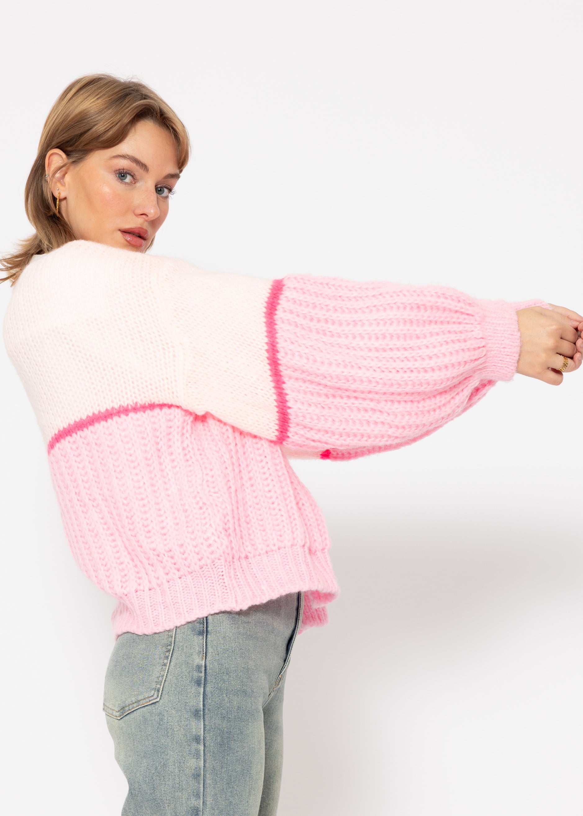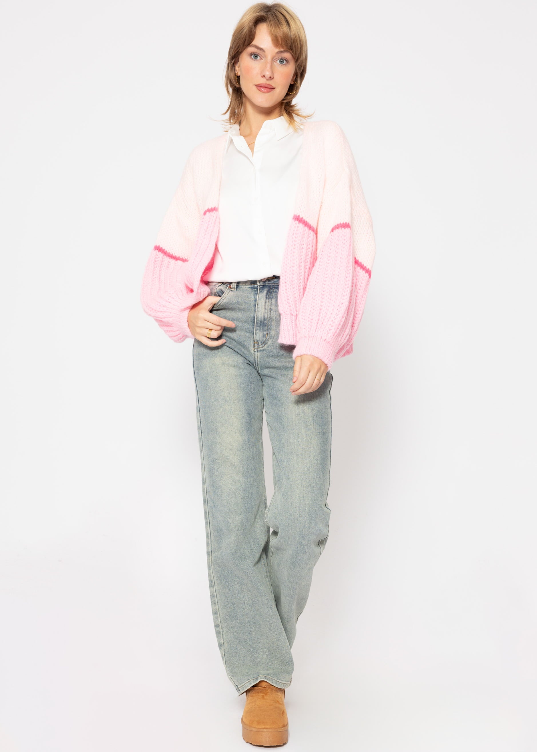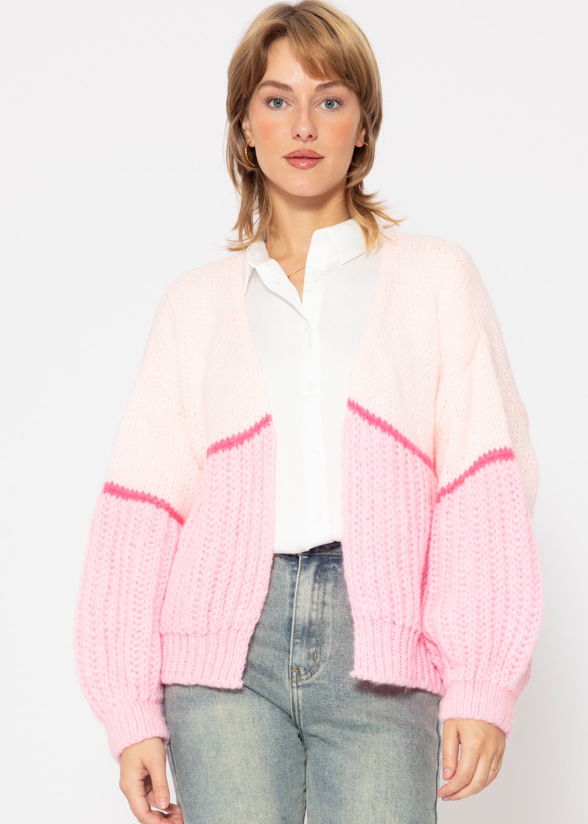 Dieser Cardigan in zarten Rosa- und Pinktönen vermittelt sofort ein Gefühl der Sinnlichkeit. Das Modell kommt in einer modernen Oversized-Passform, mit überschnittenen Schultern und gerippten Ärmel- und Saumabschluss. Die offene Silhouette erzeugt eine schmeichelhafte Linie und ermöglicht eine mühelose Schichtung über unterschiedliche Outfits. Der Cardigan zeichnet sich durch einen markanten, querlaufenden pinken Streifen unterhalb der Brustpartie sowie Mitte der Ärmel aus. Dieses Designelement setzt einen lebendigen Kontrast zu den anderen zarten Rosa-Tönen. Der Cardigan wurde aus weichem Strick gefertigt, der dich gemütlich durch kühlere Tage begleitet.