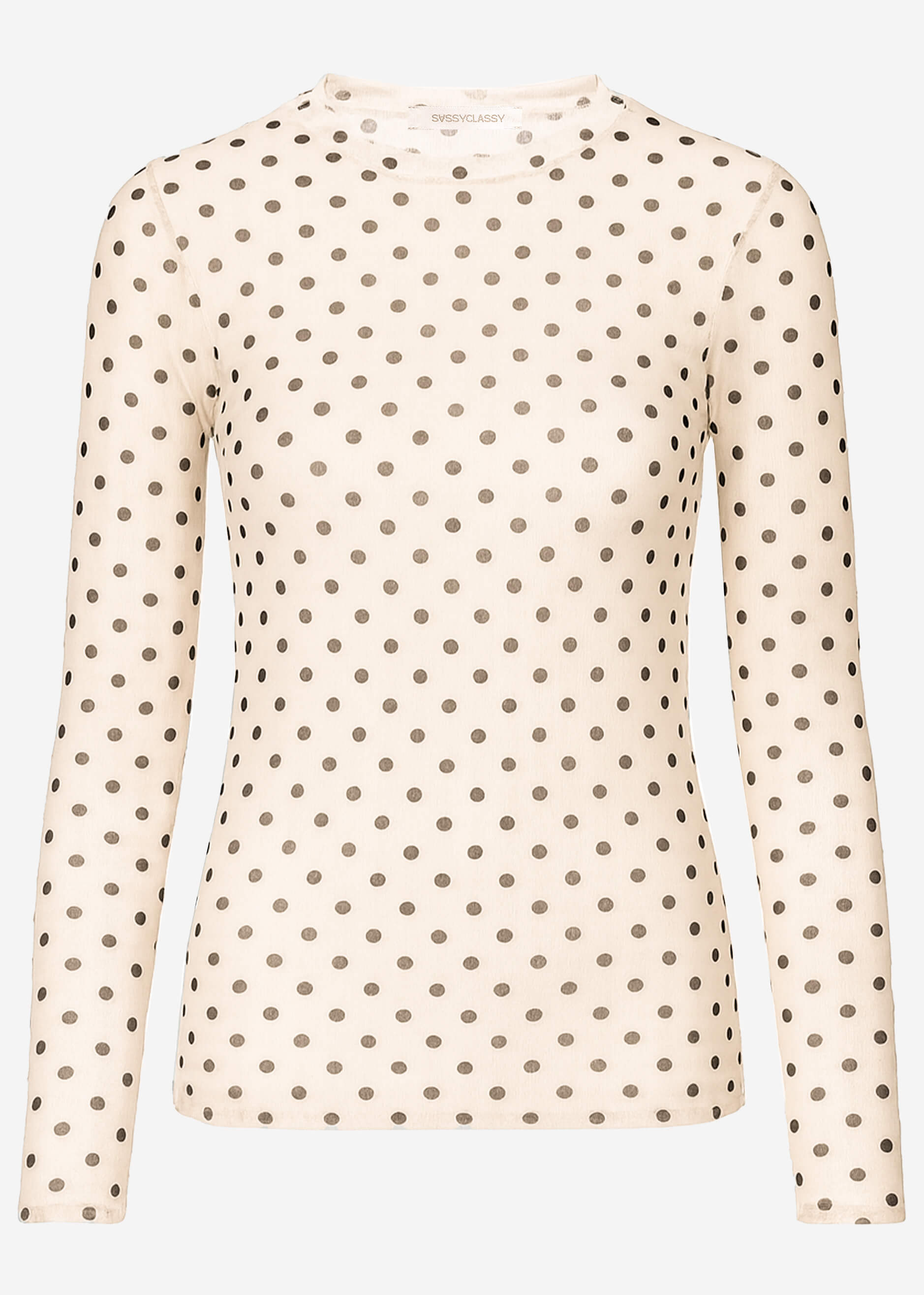 Dieses Mesh Langarmshirt in Beige verfügt über ein angesagtes Punkte-Muster, das subtile Einblicke gewährt. Es besitzt einen Rundhalsausschnitt und lange Ärmel, wobei die Vorderseite gefüttert ist.