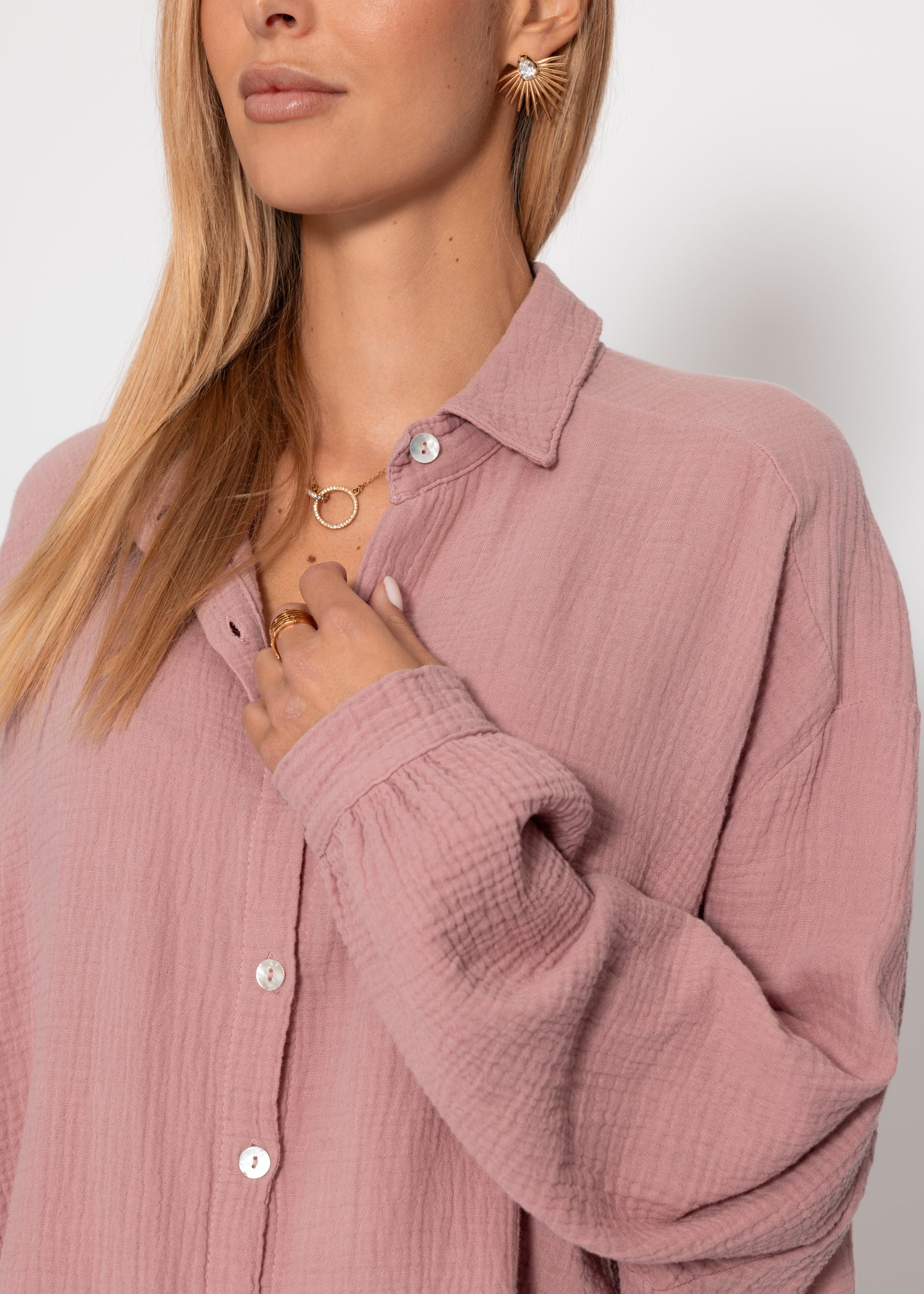 Diese kurz geschnittene Musselin Bluse in Altrosa ist ein lässig fallendes Blusenhemd aus weichem Baumwoll-Gewebe mit Perlmuttknöpfen. Der ultra Oversize-Schnitt, eine querlaufende Falte hinten, ein Kragen, ein Knopfverschluss und Manschetten an den langen Ärmeln prägen den Look.