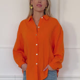 Diese orangefarbene Musselin Bluse hat einen ultra Oversize-Schnitt und Perlmuttknöpfe. Ein Kragen, Knopfverschluss und Manschetten an den langen Ärmeln verleihen ihr einen eleganten Touch.