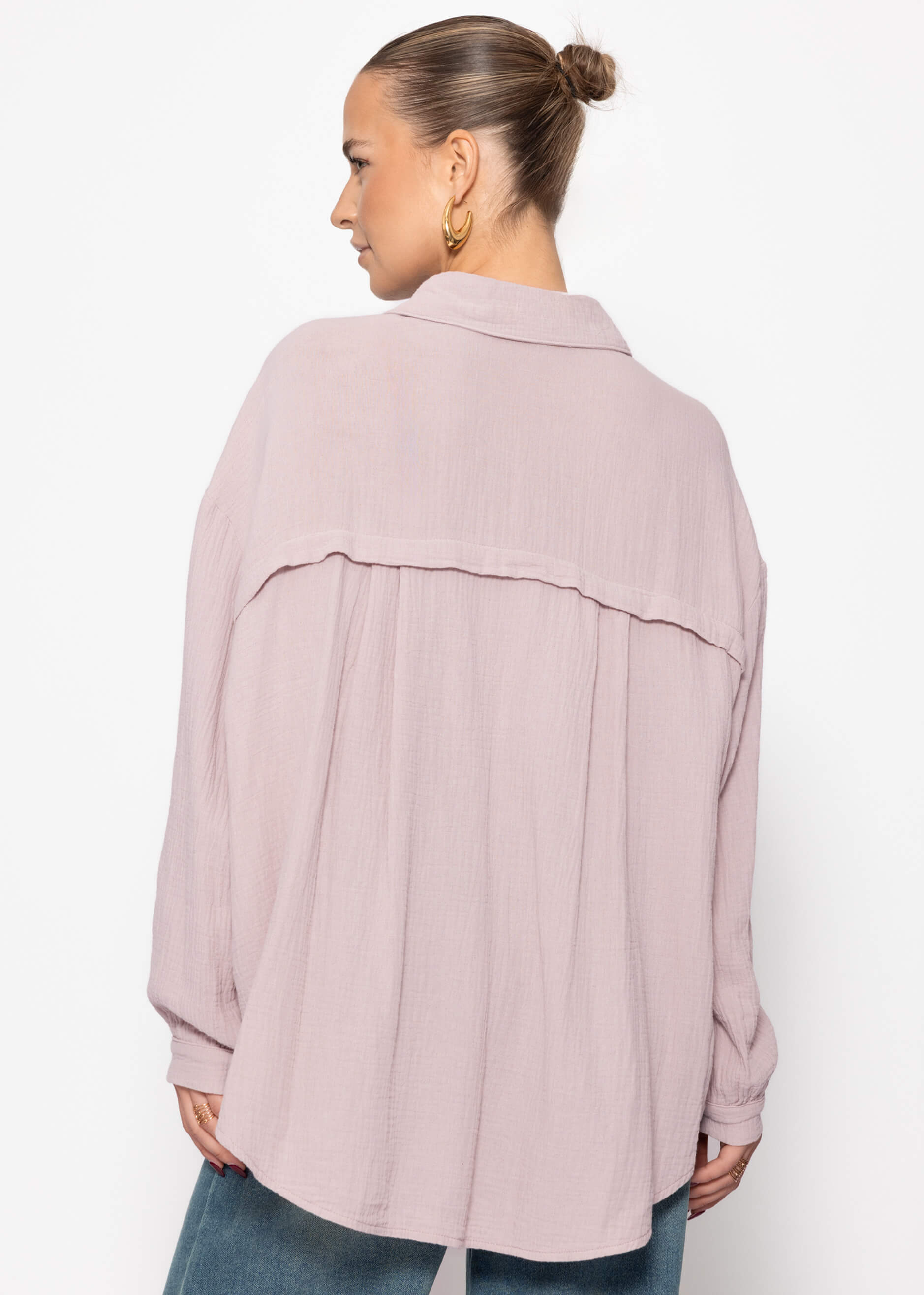 Diese kurz geschnittene Musselin Bluse in Puderrosa ist ein lässig fallendes Blusenhemd aus weichem Baumwoll-Gewebe mit Perlmuttknöpfen. Der Oversize-Schnitt, eine querlaufende Falte hinten, Kragen, Knopfverschluss und Manschetten an den langen Ärmeln runden den Look ab.
