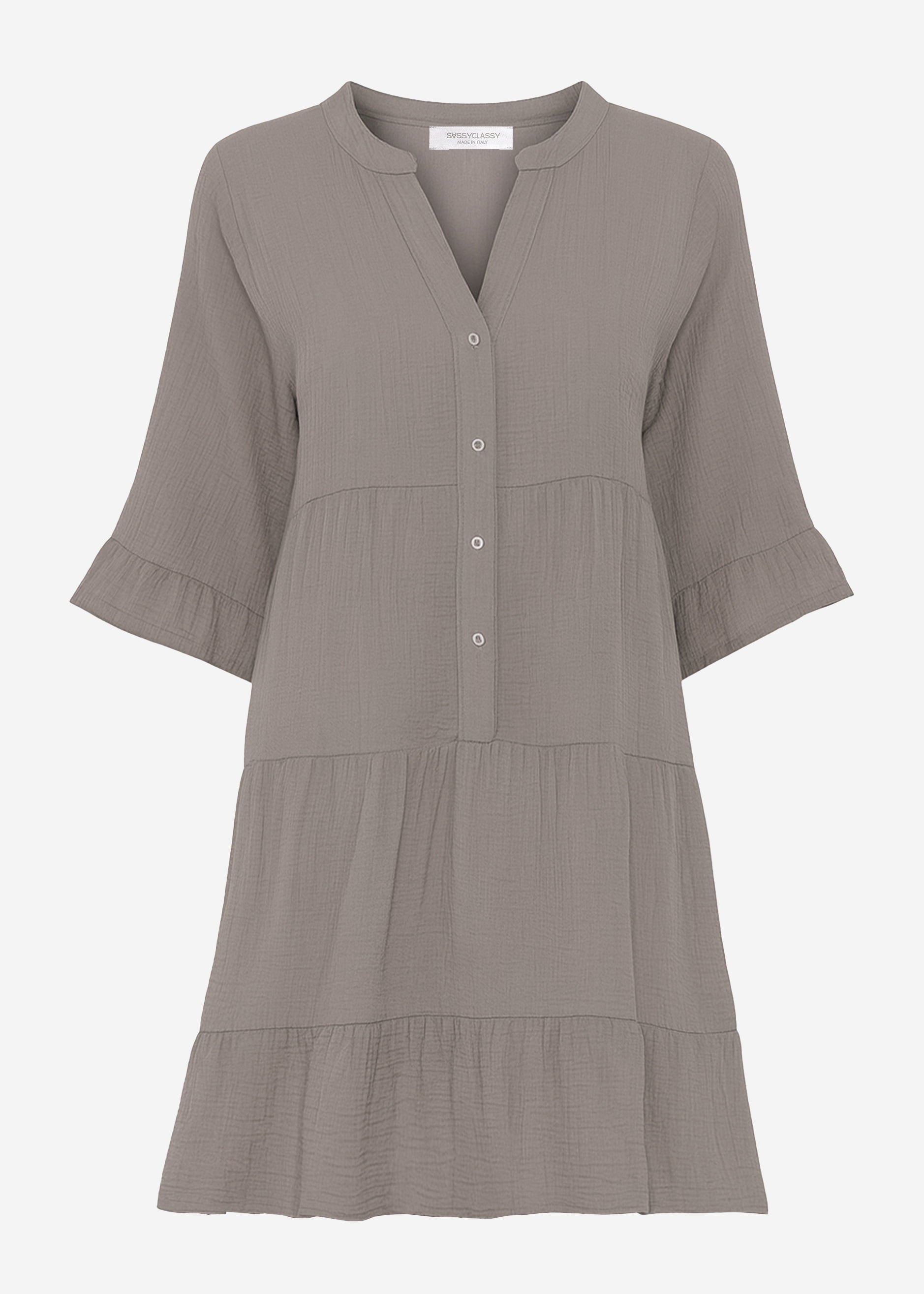 Dieses luftige Musselin-Kleid in Taupe bietet lässigen Tragekomfort und verspielte Details. Es besteht aus leichter, atmungsaktiver Baumwolle mit Volants und kurzen Rüschenärmeln.