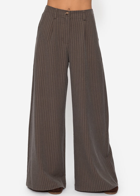 Brauner oversize Blazer mit feinen Nadelstreifen und klassischem Reverskragen. Lässiger Schnitt mit Pattentaschen und zweireihiger Knopfleiste. Dezente Schulterpolster für eine strukturierte Silhouette.