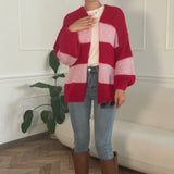 Dieser gestreifte, lockere Cardigan aus weichem Strick zeichnet sich durch eine Oversized-Passform, einen offen fallenden Schnitt und überschnittene Schultern aus. Rippbündchen an den Ärmeln und ein gerippter Saum runden das Design ab.