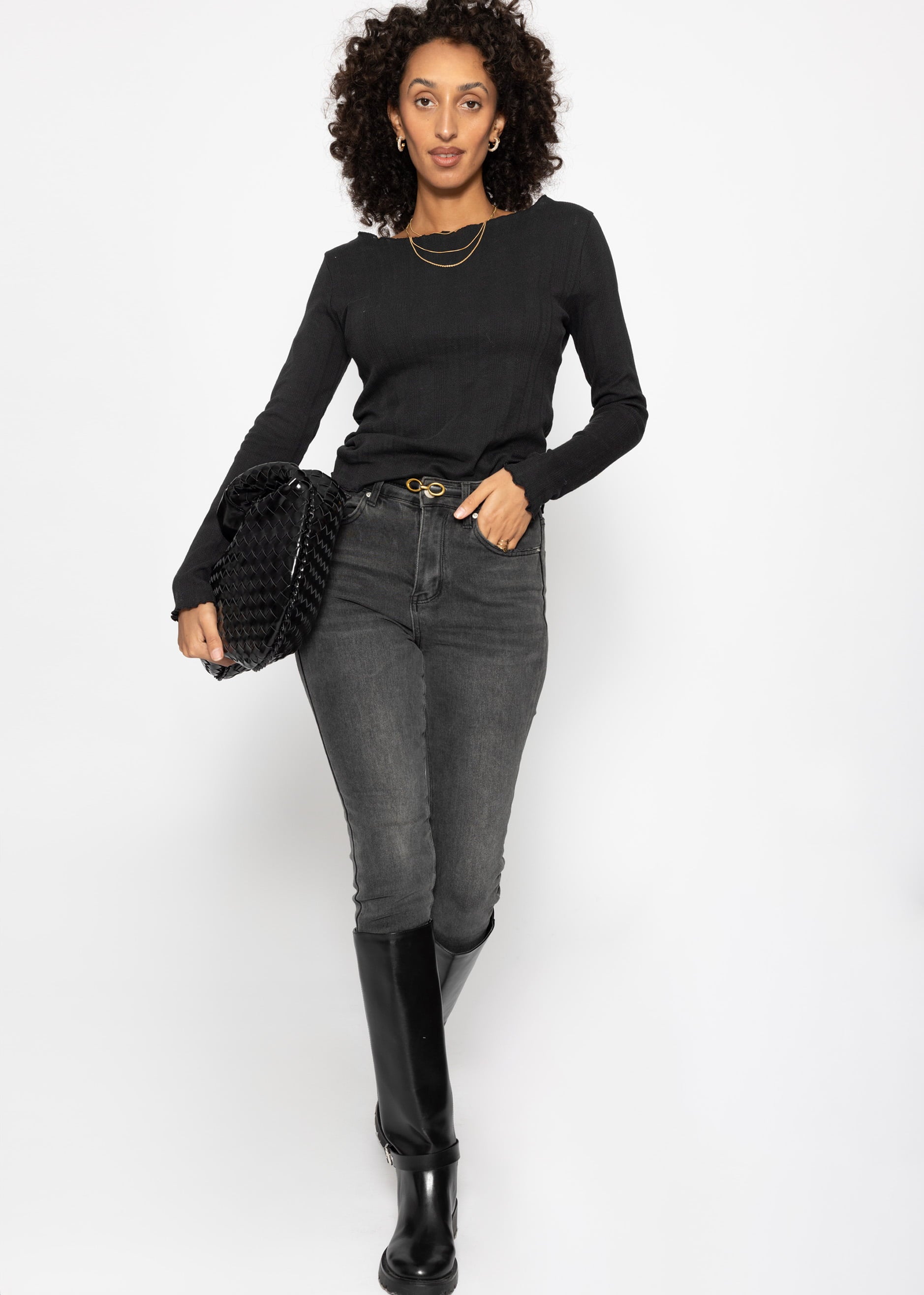 Pointelle Langarmshirt in Schwarz