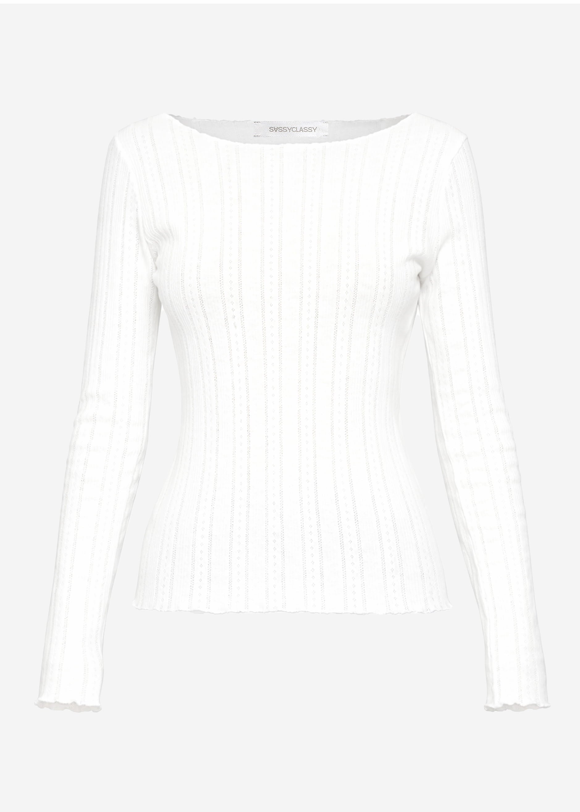 Weißes Pointelle-Langarmshirt mit femininem Lochmuster und elegantem U-Boot-Ausschnitt. Figurbetonter Schnitt mit langen Ärmeln und leicht gewelltem Saum für eine dezente, verspielte Note. Ein vielseitiges Basic, das sich ideal für elegante wie auch lässige Looks eignet.
