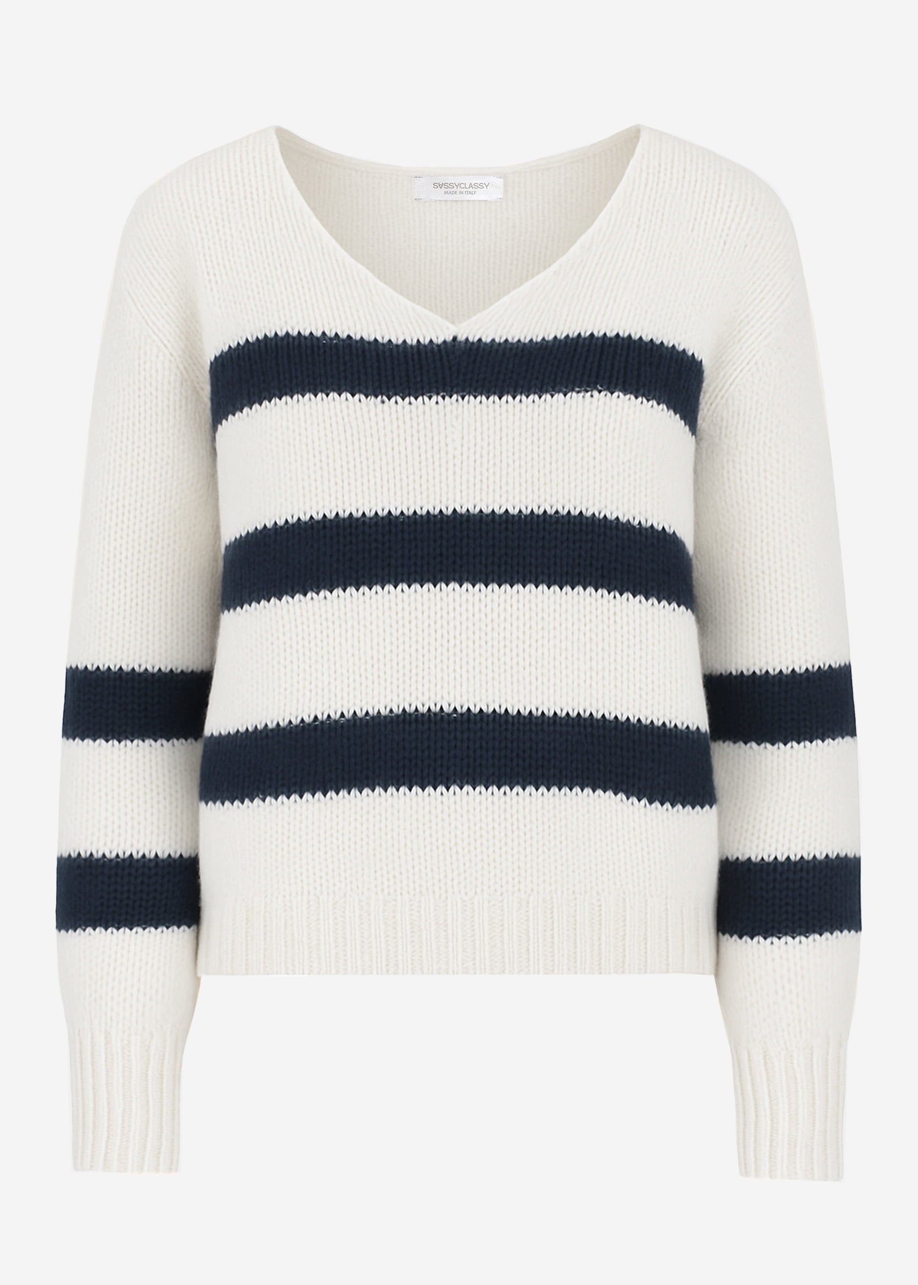 Dieser Oversize Pullover ist aus super weichem, lockerem Strick gefertigt. Er verfügt über einen V-Ausschnitt, lange Ärmel mit Bündchen und dunkelblaue Streifen.