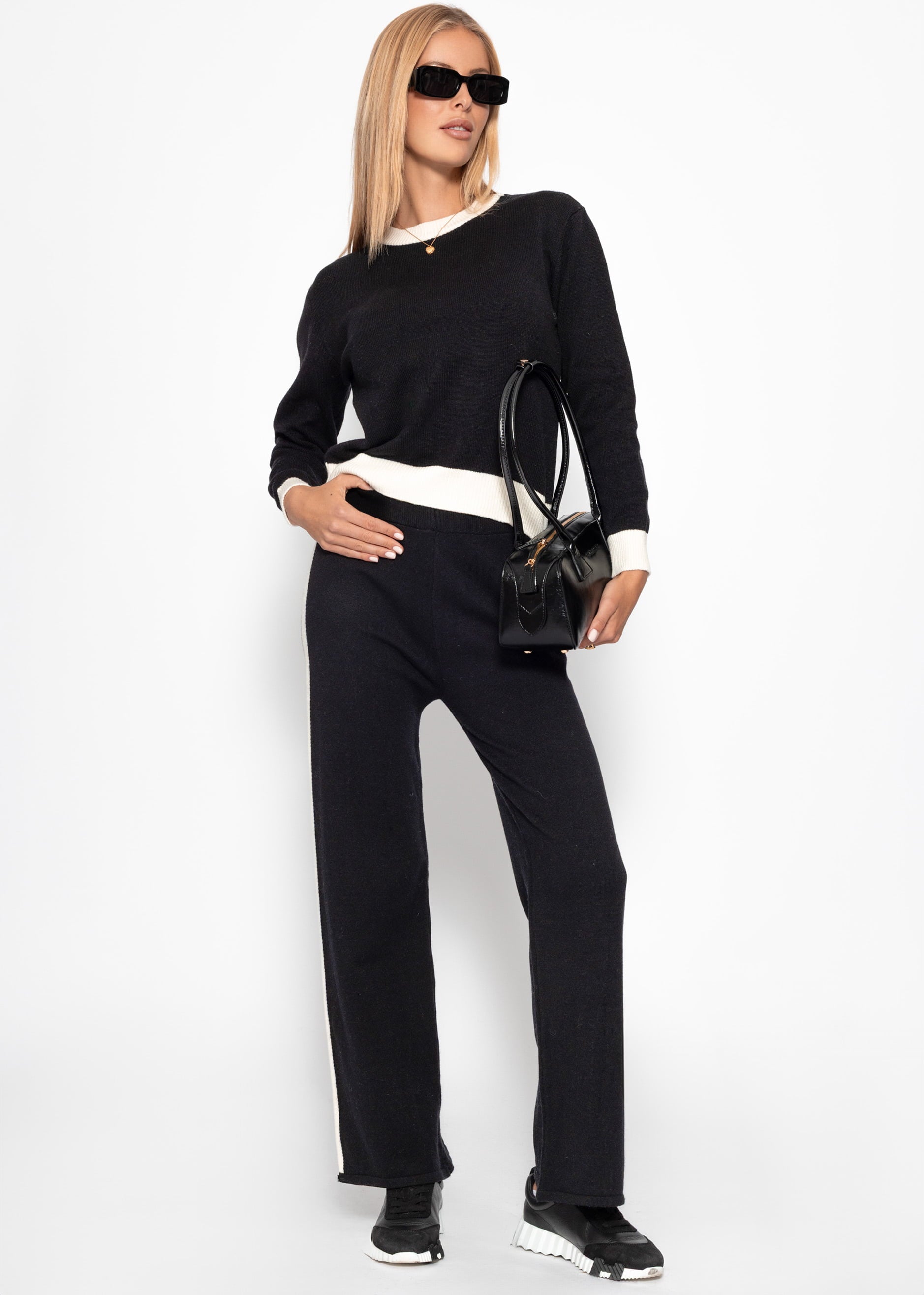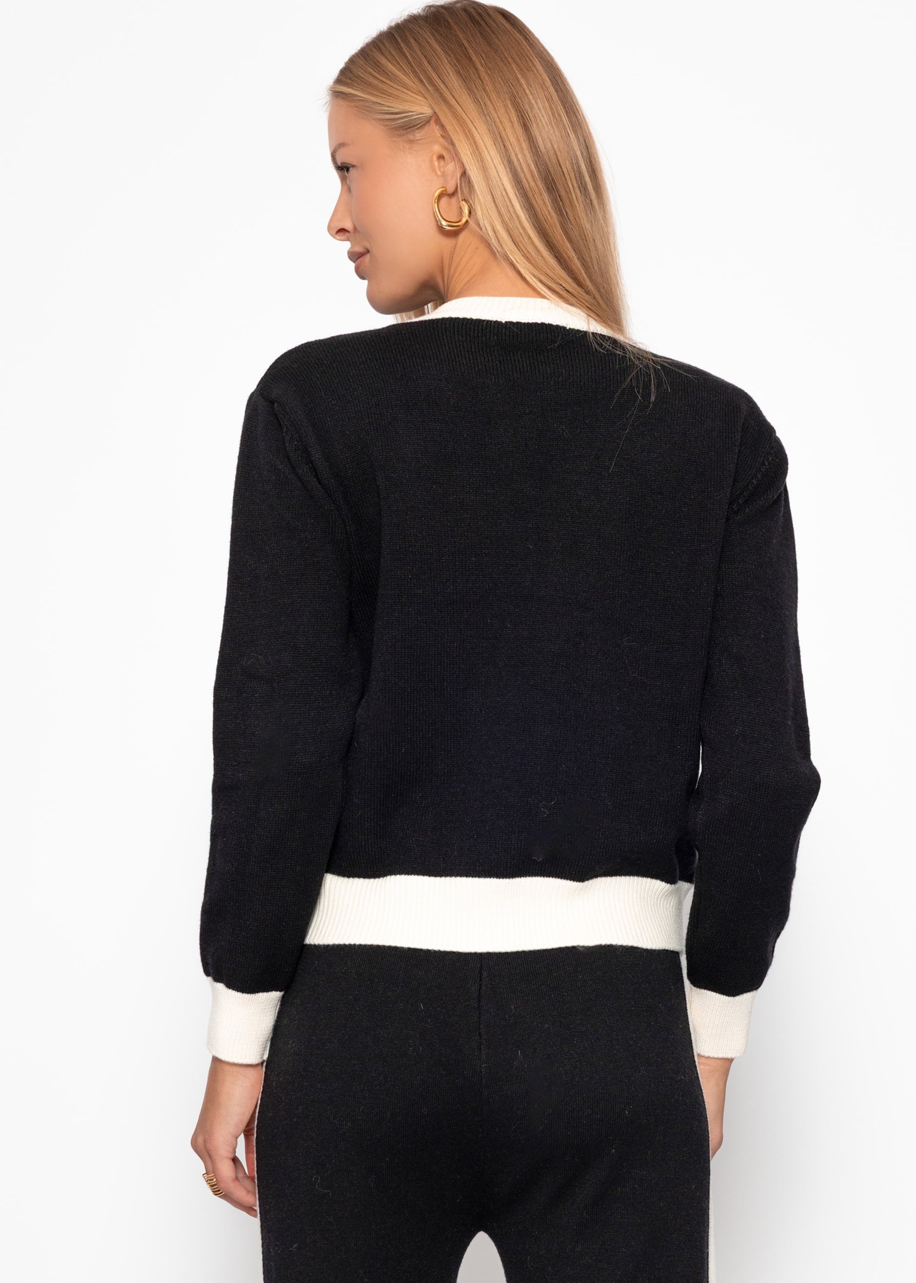 Dieser Feinstrickpullover aus einer weichen Viskose-Mischung verbindet zeitlose Eleganz mit modernem Design. Der schwarze Grundton wird durch stilvolle, kontrastierende offwhite Abschlüsse an Rundhalsausschnitt, Ärmeln und Saum akzentuiert.