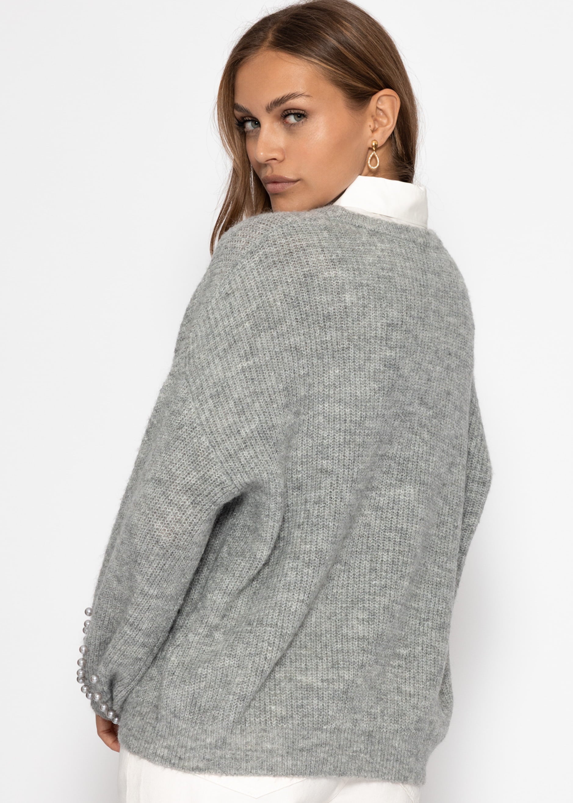 Dank des klassischen Rundhalsausschnitts und der modernen Oversize-Passform bietet dieser Pullover ein entspanntes Tragegefühl. Die überschnittenen Schultern unterstreichen den lockeren Look und machen ihn zu einem vielseitigen Must-Have. Ein besonderes Highlight sind die zarten Perlendetails an den Ärmelenden, die dem Pullover eine elegante, feminine Note verleihen. Er ist perfekt für stilvolle Everyday-Looks, egal ob zu Jeans, Stoffhosen oder Röcken.