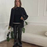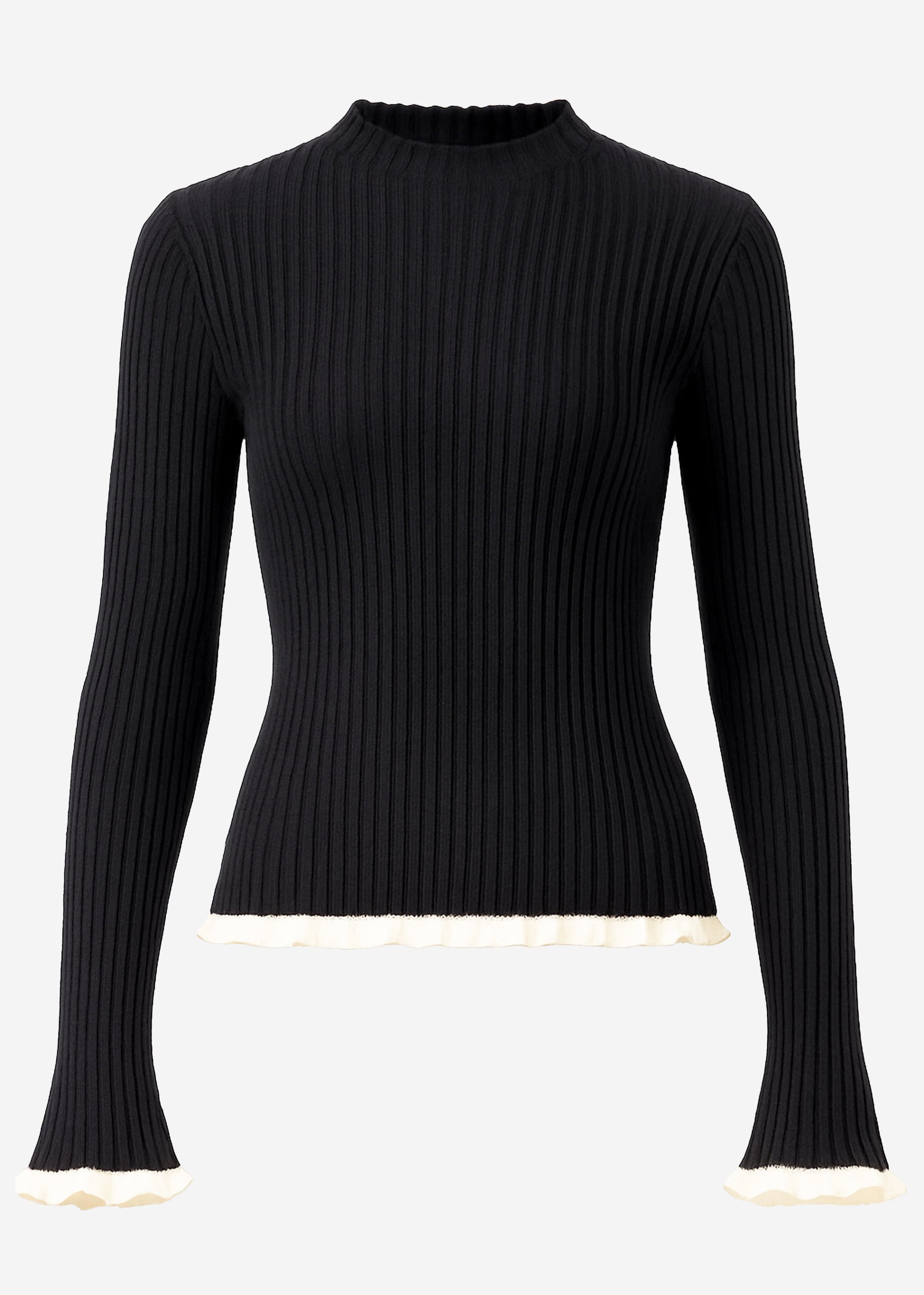 Schwarzer Rippstrick-Pullover mit kontrastierenden Wellenvolants an Ärmeln und Saum. Figurbetonter Schnitt mit hohem Rundhalsausschnitt für eine elegante Silhouette. Das elastische, weich gestrickte Material sorgt für angenehmen Tragekomfort.