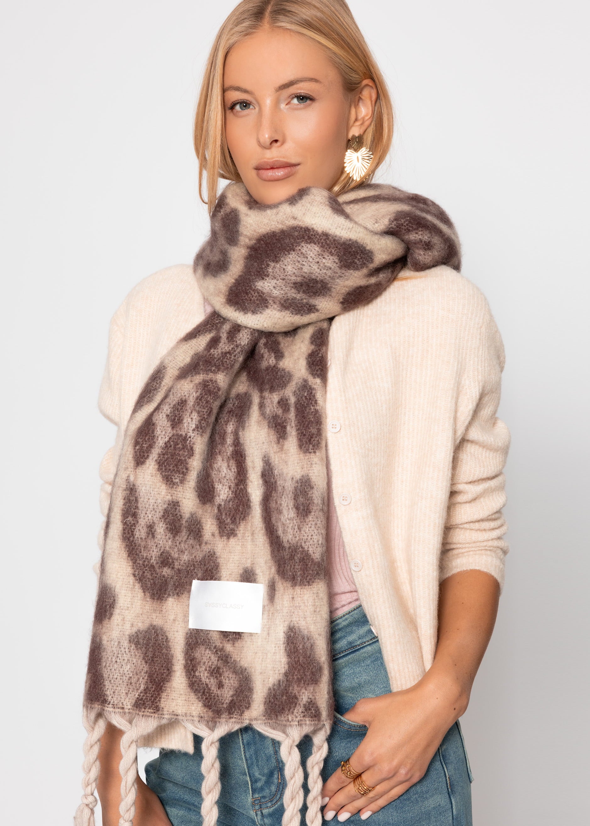 Dieser Schal bietet nicht nur Wärme und Komfort, sondern hebt deinen Stil auf ein neues Level. Das Modell besitzt ein angesagtes Leoprint sowie Fransen an den Enden, die für visuelles Interesse sorgen und deinem Outfit eine auffällige Note verleiht. Hergestellt aus flauschigem Material bietet der Schal höchsten Tragekomfort sowie Schutz an kalten Tagen. Er trägt ein elegantes, qualitätvolles Label, das für einen Hauch von Luxus sorgt. Dieses hochwertige Accessoire verbindet Eleganz und Funktionalität auf geschmackvolle Weise und begleitet dich stilvoll durch den Winter.