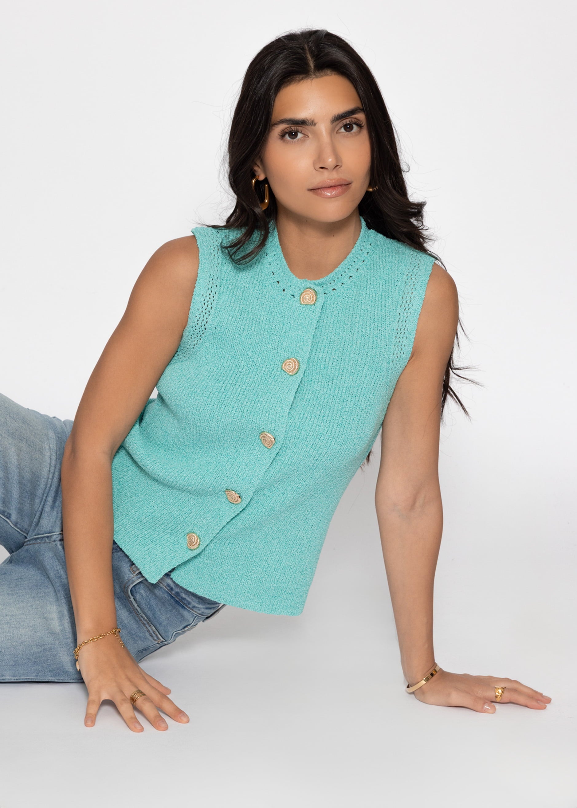Ärmelloses Stricktop mit Knopfleiste und auffälligen Muschelknöpfen. Feine Strickstruktur mit cleanem Rundhalsausschnitt und leicht geradem Schnitt. Dezente Lochstrick-Details entlang der Schultern unterstreichen die sommerliche Optik.
