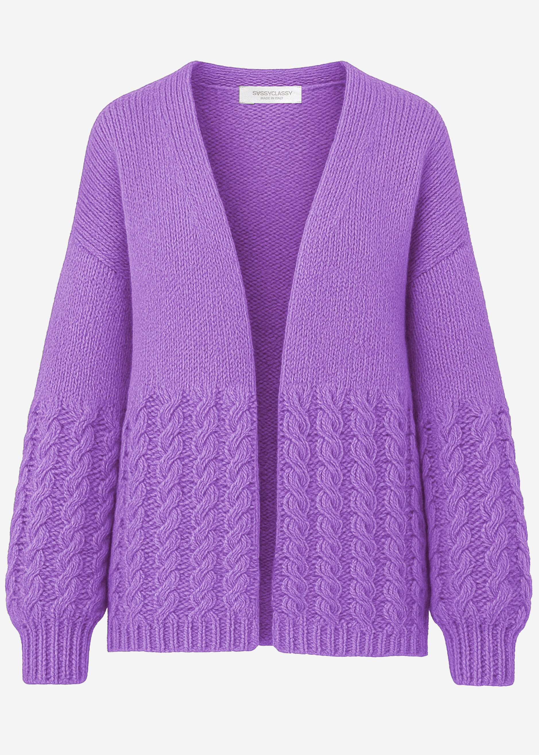 Dieser kuschelige Cardigan verbindet femininen Charme mit lässiger Gemütlichkeit. Das aufwendig gearbeitete Zopfmuster an Ärmeln und Rücken verleiht dem Strickstück eine besondere Struktur und macht es zu einem echten Blickfang. Dank des offenen Schnitts lässt sich der Cardigan vielseitig kombinieren – ob entspannt zu Jeans und T-Shirt oder elegant über einem Kleid. Das weiche Strickmaterial sorgt für ein angenehmes Tragegefühl und hält an kühleren Tagen wohlig warm. Ein modisches Highlight, das Komfort und Stil perfekt verbindet!