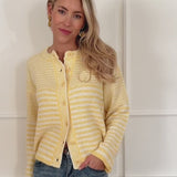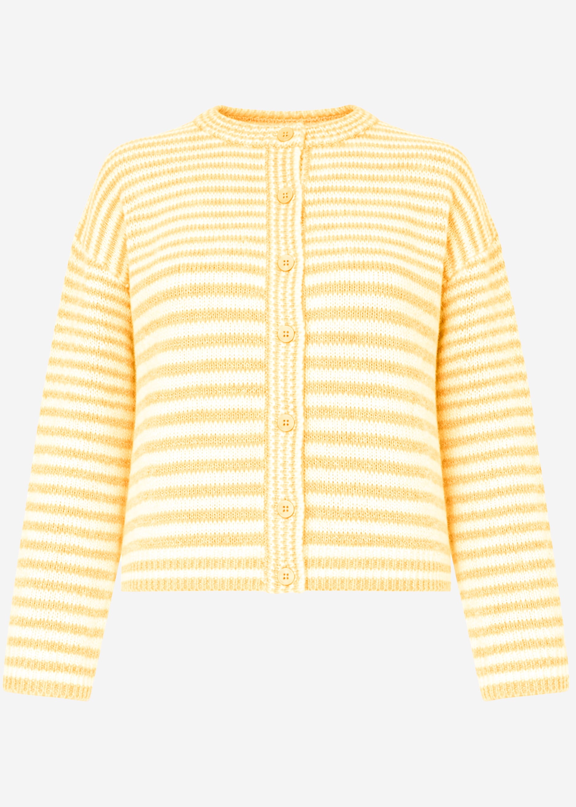 Strickjacke mit grafischem Streifenbild in zarten Gelb- und Offwhite-Tönen für einen frischen, modernen Look. Das klare Streifenmuster wird durch die durchgehende Knopfleiste stilvoll ergänzt. Der lockere Schnitt und die weiche Strickqualität sorgen für angenehmen Tragekomfort.