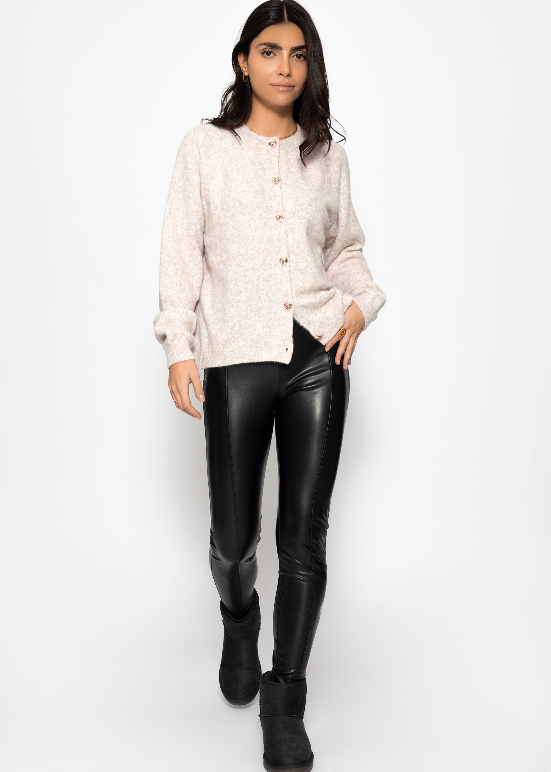 Cardigan mit dekorativen, herzförmigen Knöpfen entlang der Front. Weicher Feinstrick mit klassischen Rippbündchen an Ärmeln und Saum. Lockerer Schnitt für einen gemütlichen, vielseitigen Look.