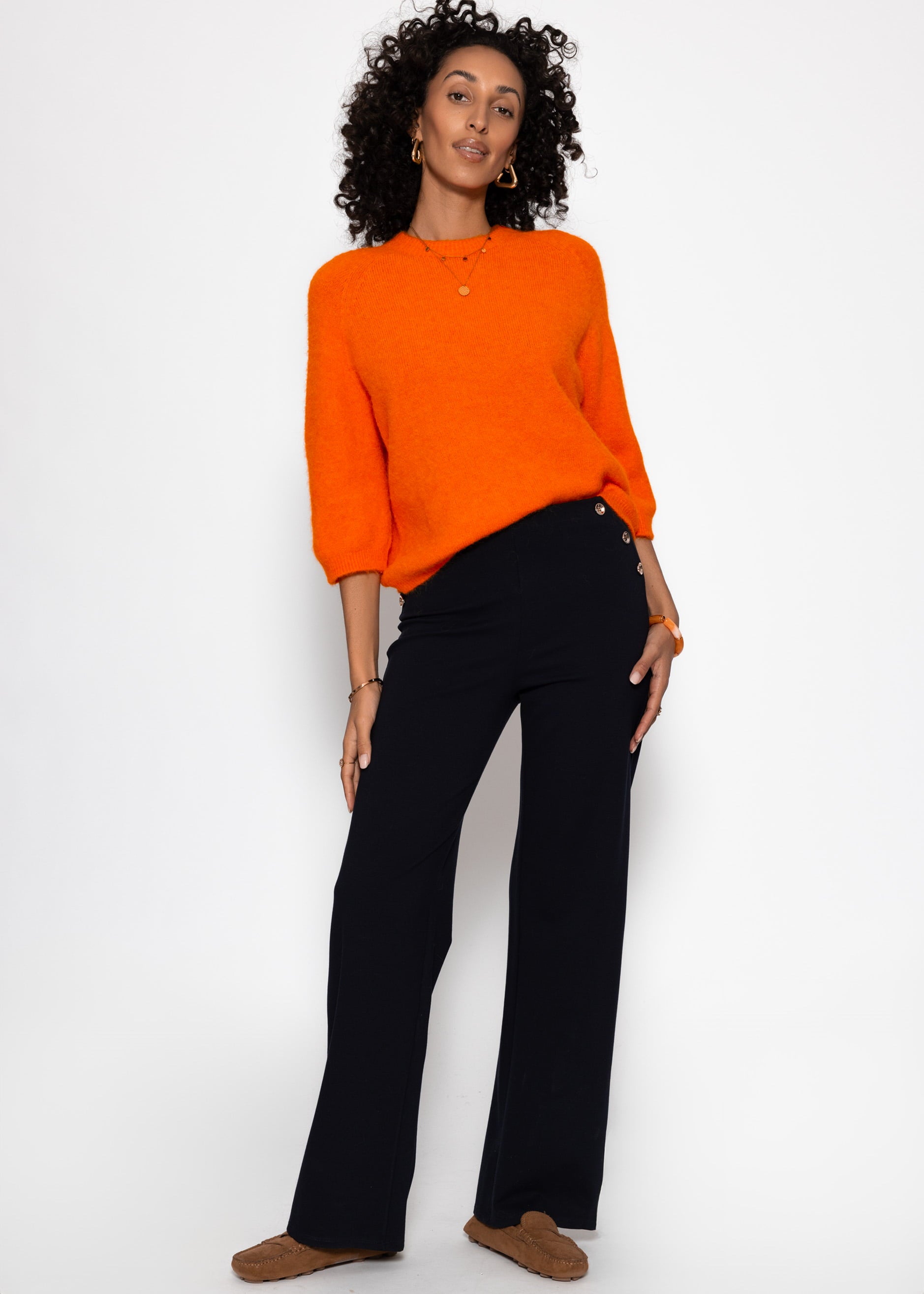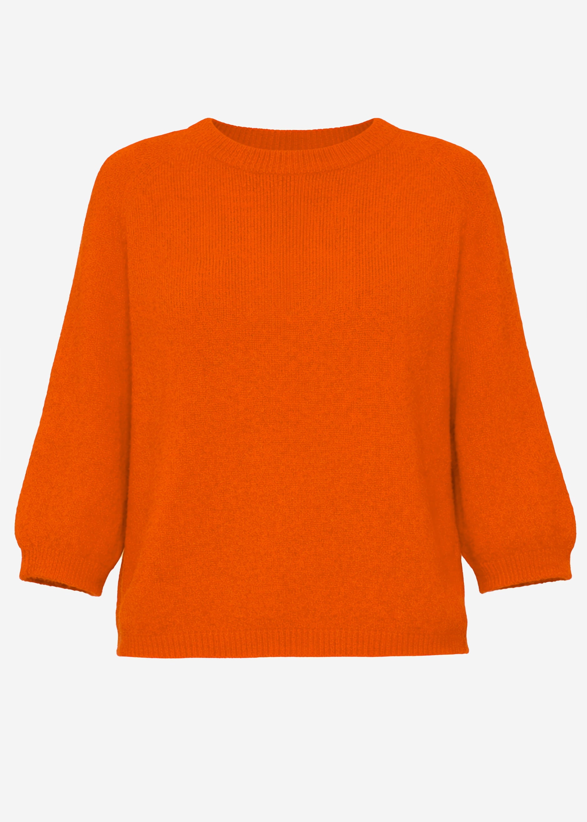 Dieses Strickoberteil in Orange vereint zeitlose Eleganz mit kuscheligem Tragekomfort. Es verfügt über einen Rundhalsausschnitt, halblange Ärmel und eine lockere Passform.