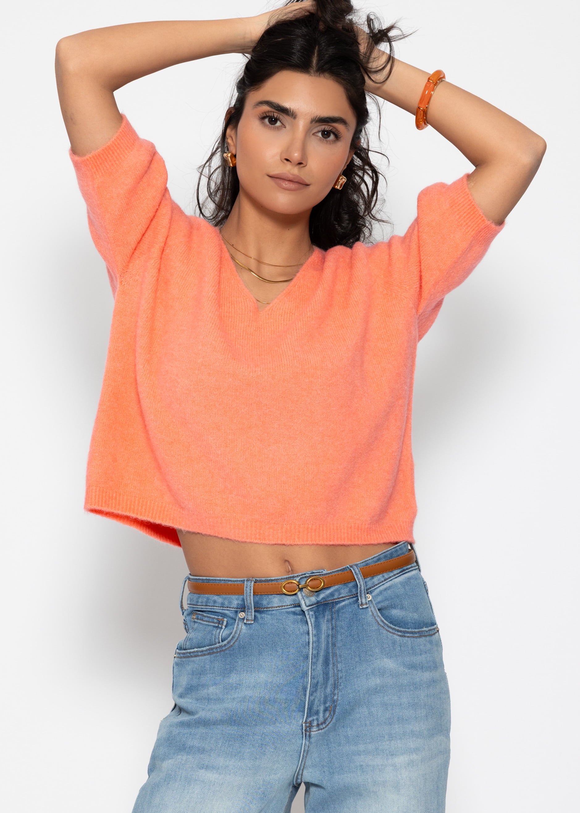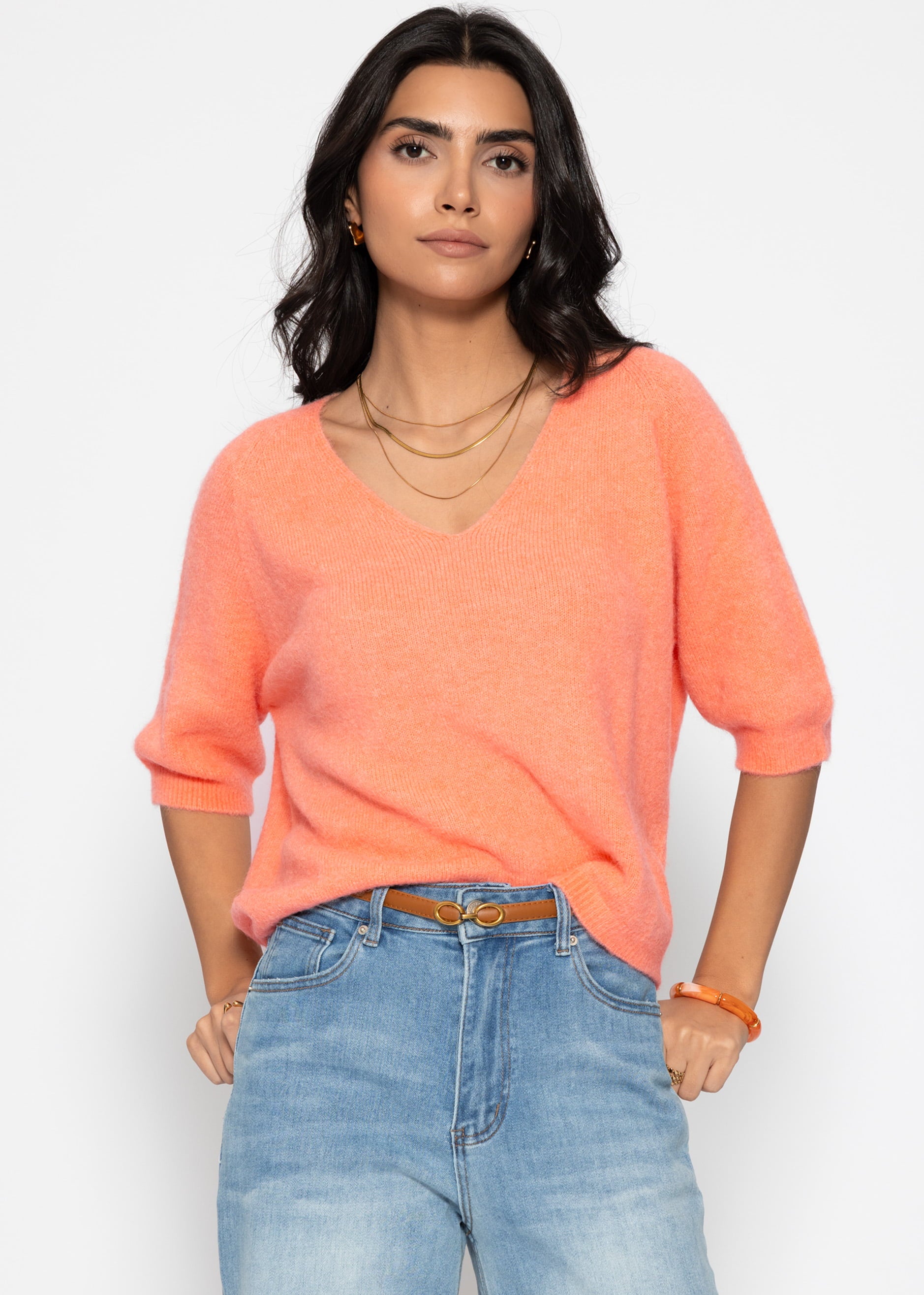 Feinstrick-Pullover in zartem Koralle. V-Ausschnitt und halblange Ärmel mit gerippten Abschlüssen sorgen für eine feminine Silhouette. Weiche Strickqualität und lockerer Schnitt für eine bequeme Passform.