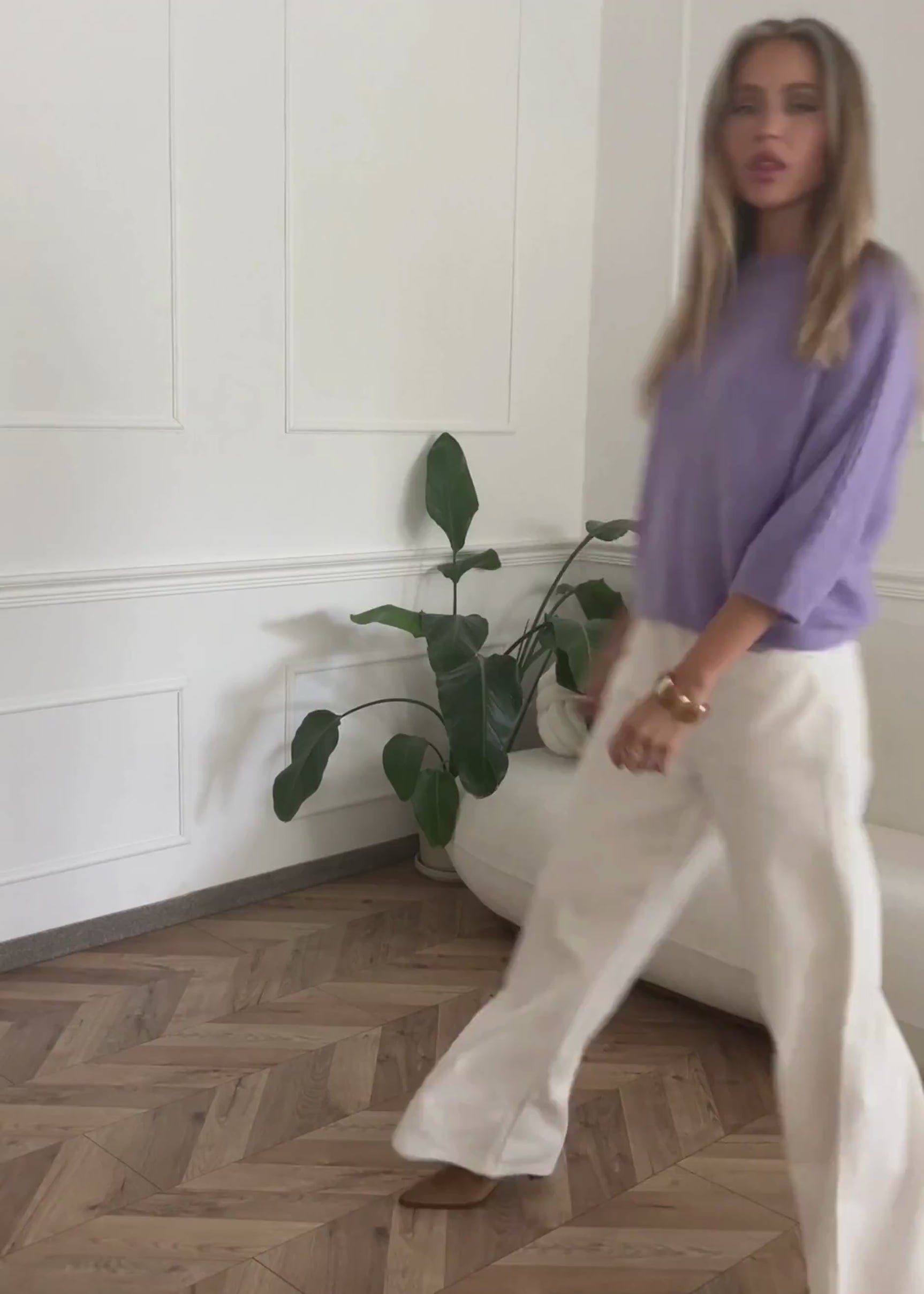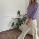 Dieses Strickoberteil in Flieder bietet zeitlose Eleganz und kuscheligen Tragekomfort. Es verfügt über einen Rundhalsausschnitt und halblange Ärmel mit dezentem Zopfmuster.