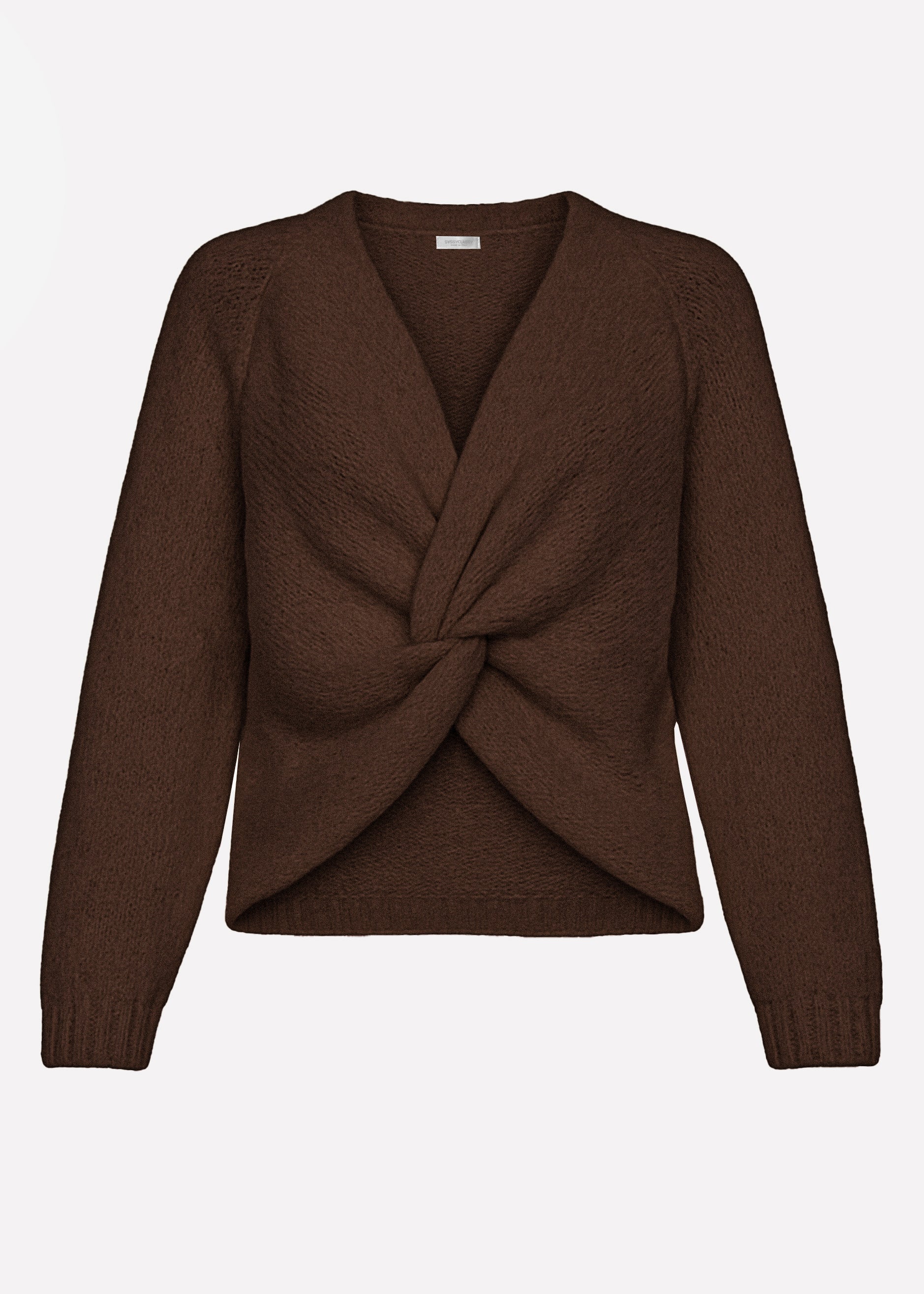 Dieser Strickpullover in Braun überzeugt durch seinen kuschelweichen Strick und die Möglichkeit, ihn beidseitig zu tragen. Er bietet einen tiefen V-Ausschnitt mit Knotendetail oder einen klassischen Rundhalsausschnitt.