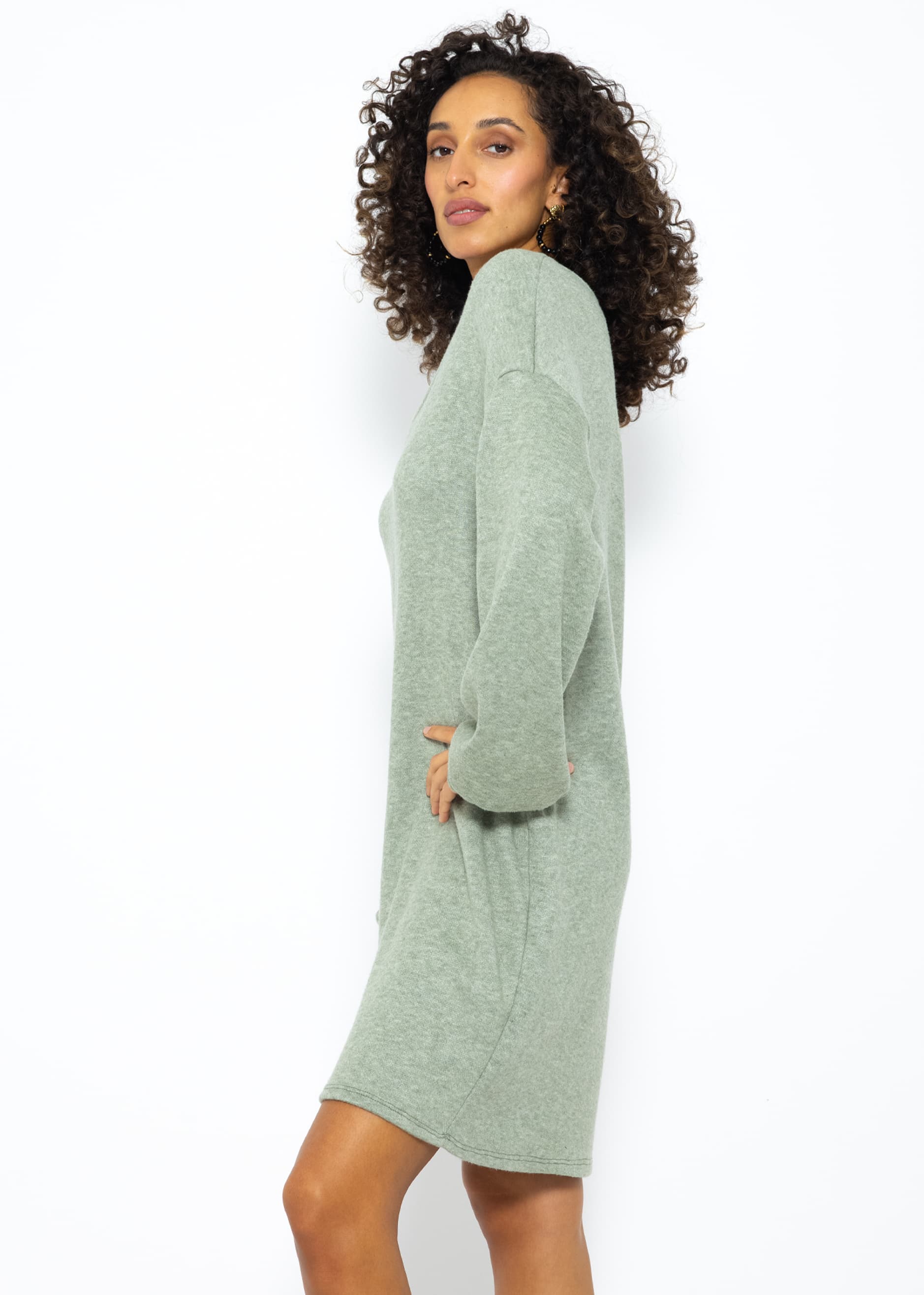 Dieses Kleid besteht aus einem hochwertigen Jersey-Material, das nicht nur unglaublich weich und flauschig ist, sondern auch ein besonders gemütliches Trageerlebnis verspricht. Die sorgfältig ausgewählte Stoffqualität schmiegt sich sanft an den Körper und verleiht dem Kleid eine luxuriöse Haptik. Das Modell präsentiert einen eleganten, etwas tiefer geschnittenen V-Ausschnitt mit einer ansprechenden Blende, die dem Kleid eine raffinierte Note verleiht. Die lockere Passform mit überschnittenen Schultern sorgt für eine lässige Eleganz, die den zeitgemäßen Look betont. Die langen Ärmel des Kleides schließen mit feinen Bündchen ab.