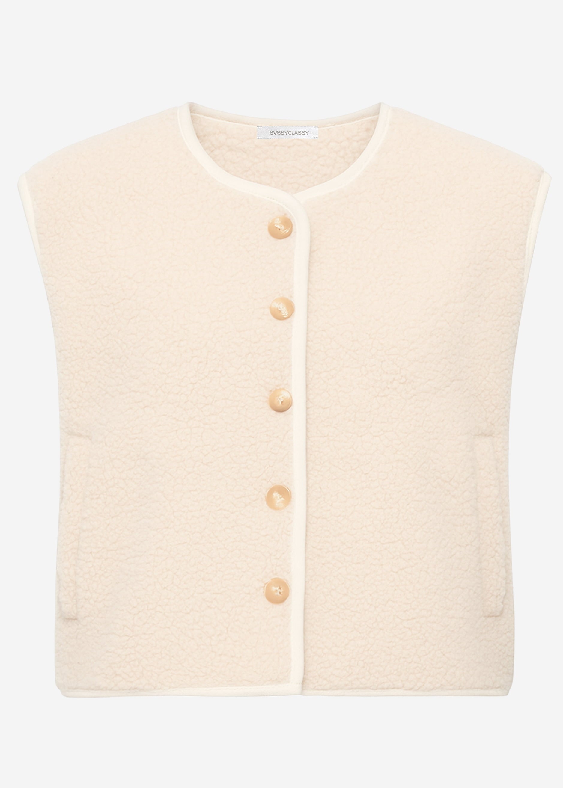 Diese Teddyweste in Beige besteht aus weichem Teddy-Material, das ein angenehmes Tragegefühl bietet und an kühleren Tagen warm hält. Das Modell verfügt über eine Knopfleiste mit Hornknöpfen und einen verkürzten Schnitt.