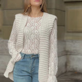 Cremefarbenes Langarmshirt aus transparenter Spitze mit floralem Muster. Figurbetonter Schnitt mit Rundhalsausschnitt und leicht ausgestellten Ärmeln. Feminine Optik durch feine Spitze und zarte Transparenz.