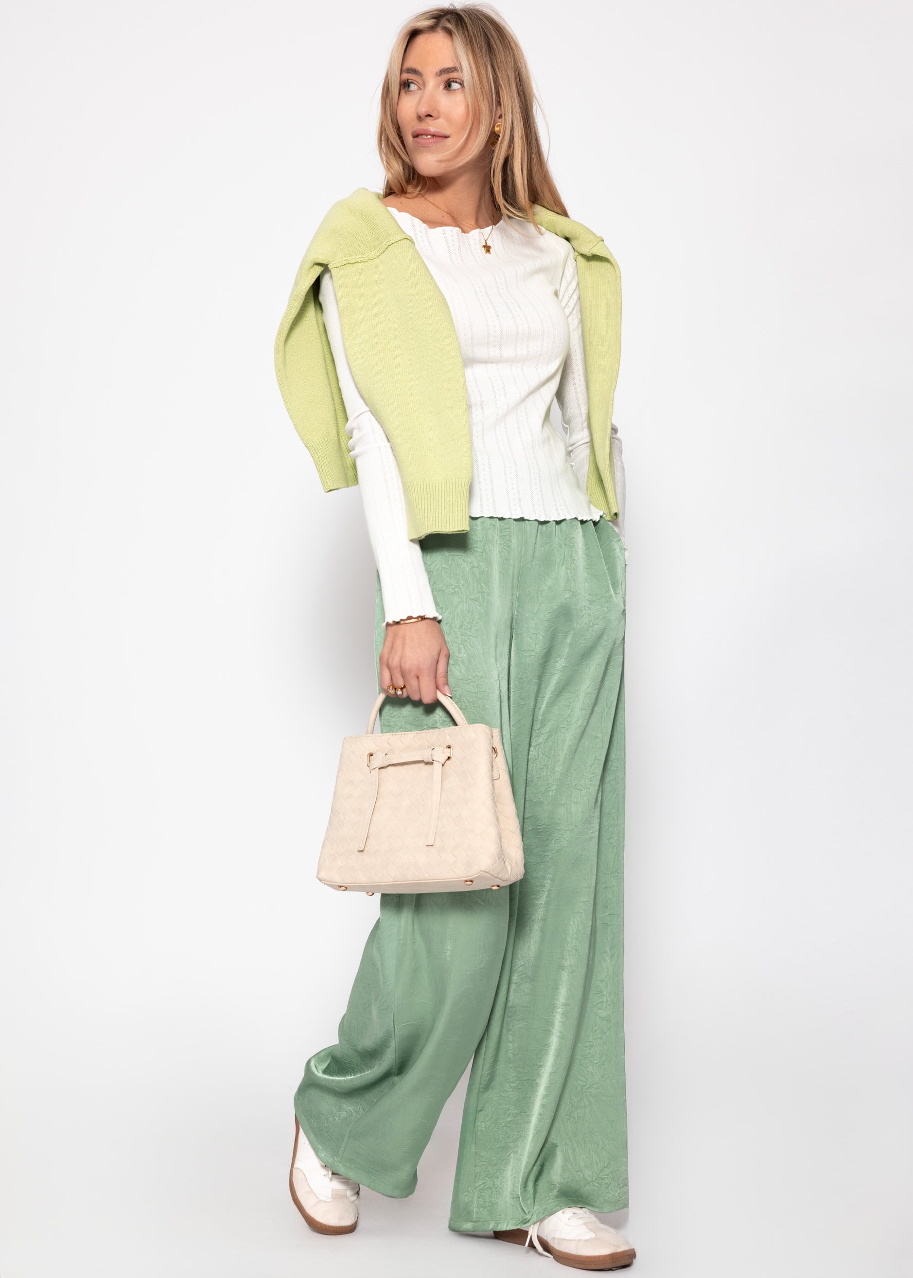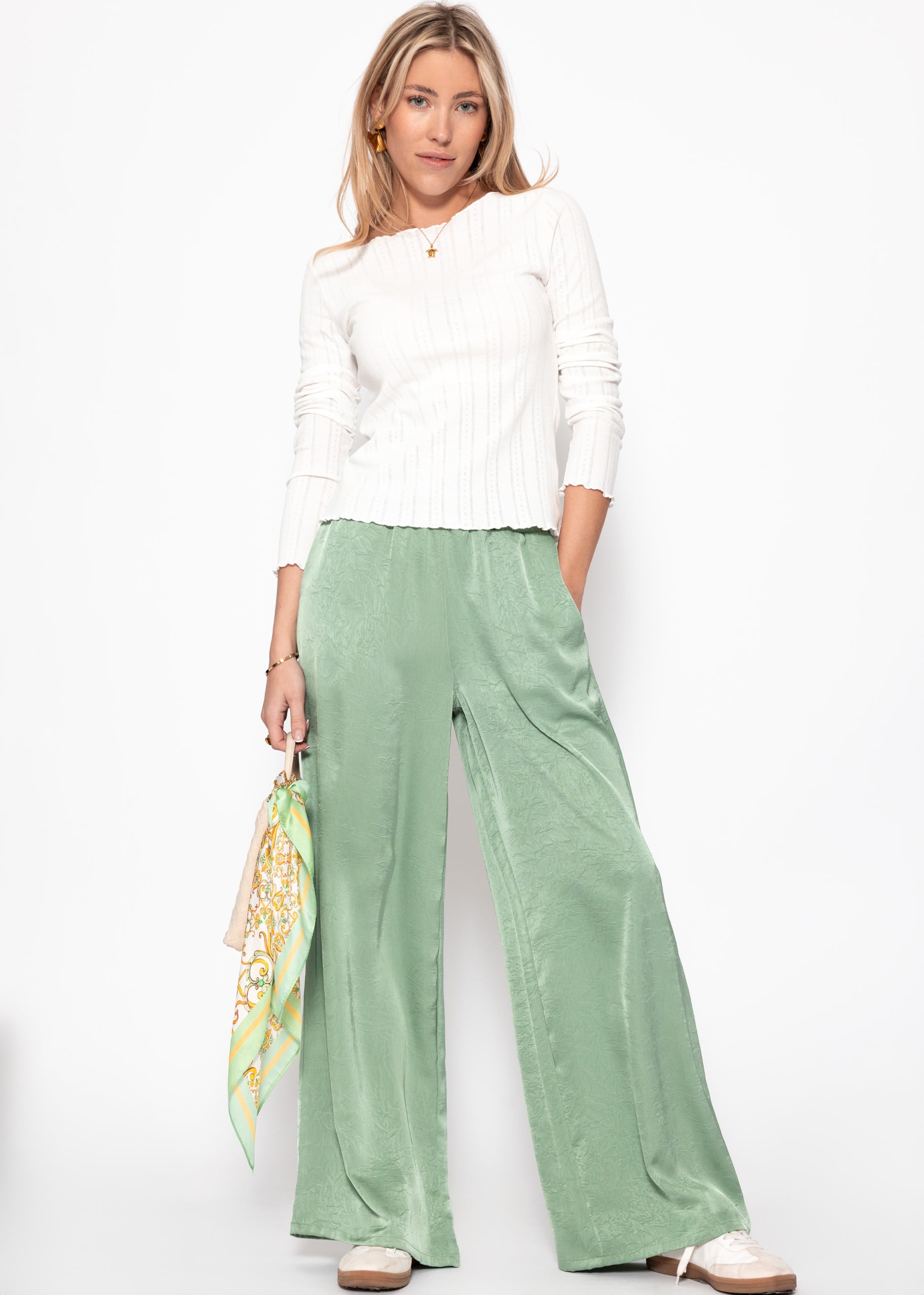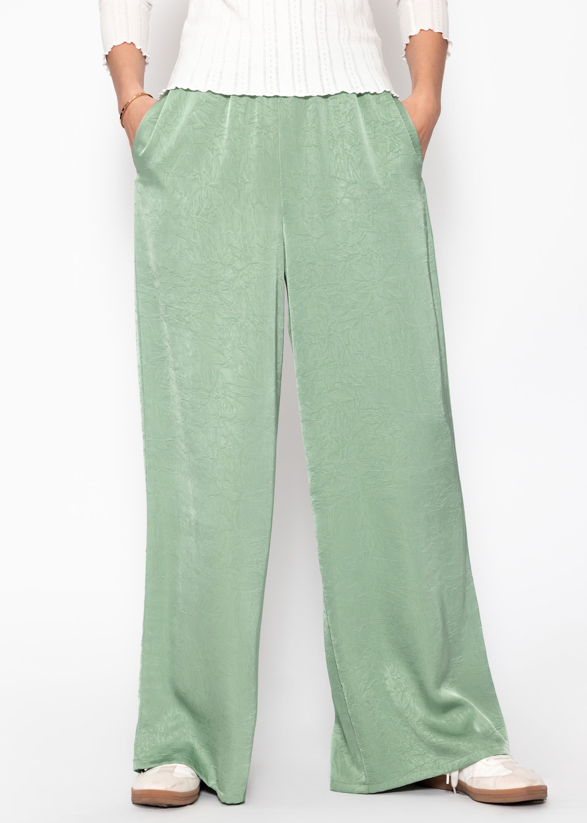 Weite Satin Hose mit Crinkle-Struktur - pistaziengrün