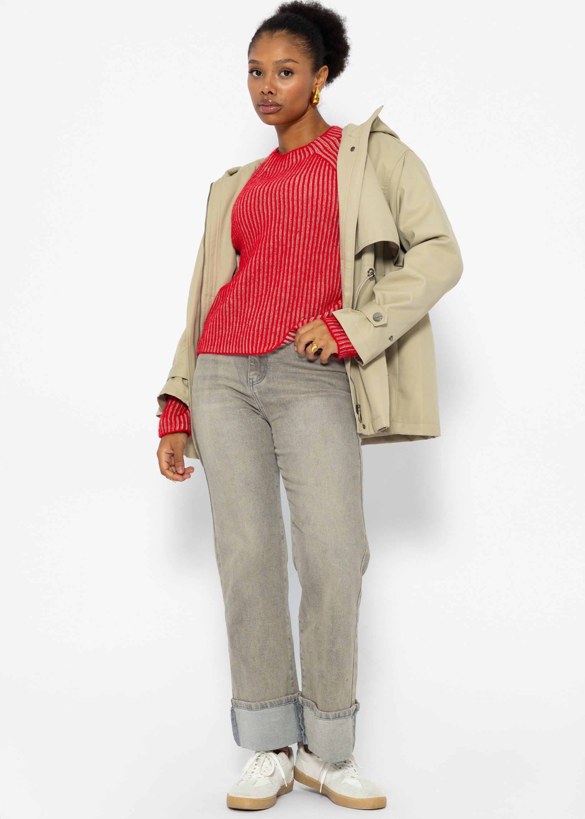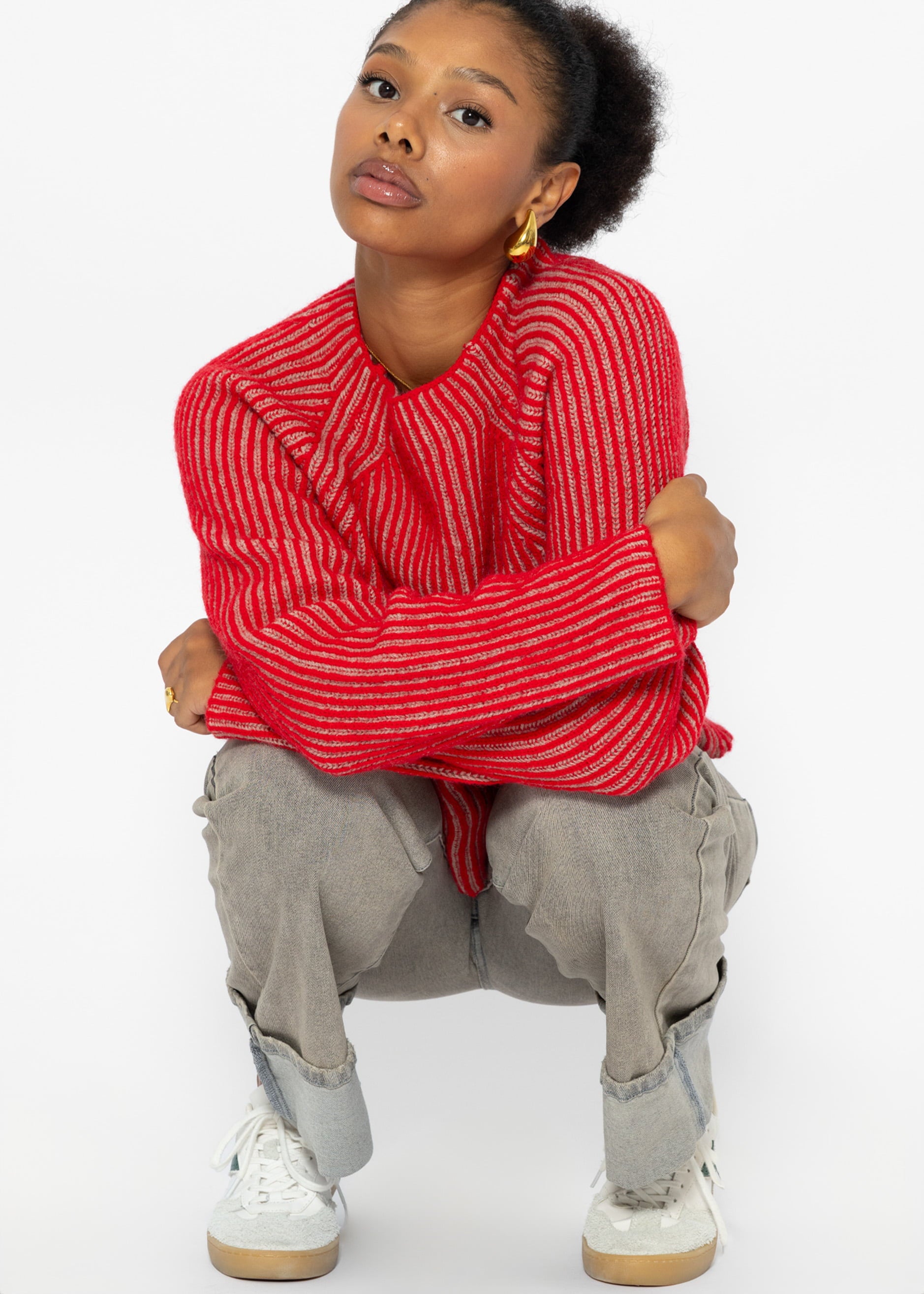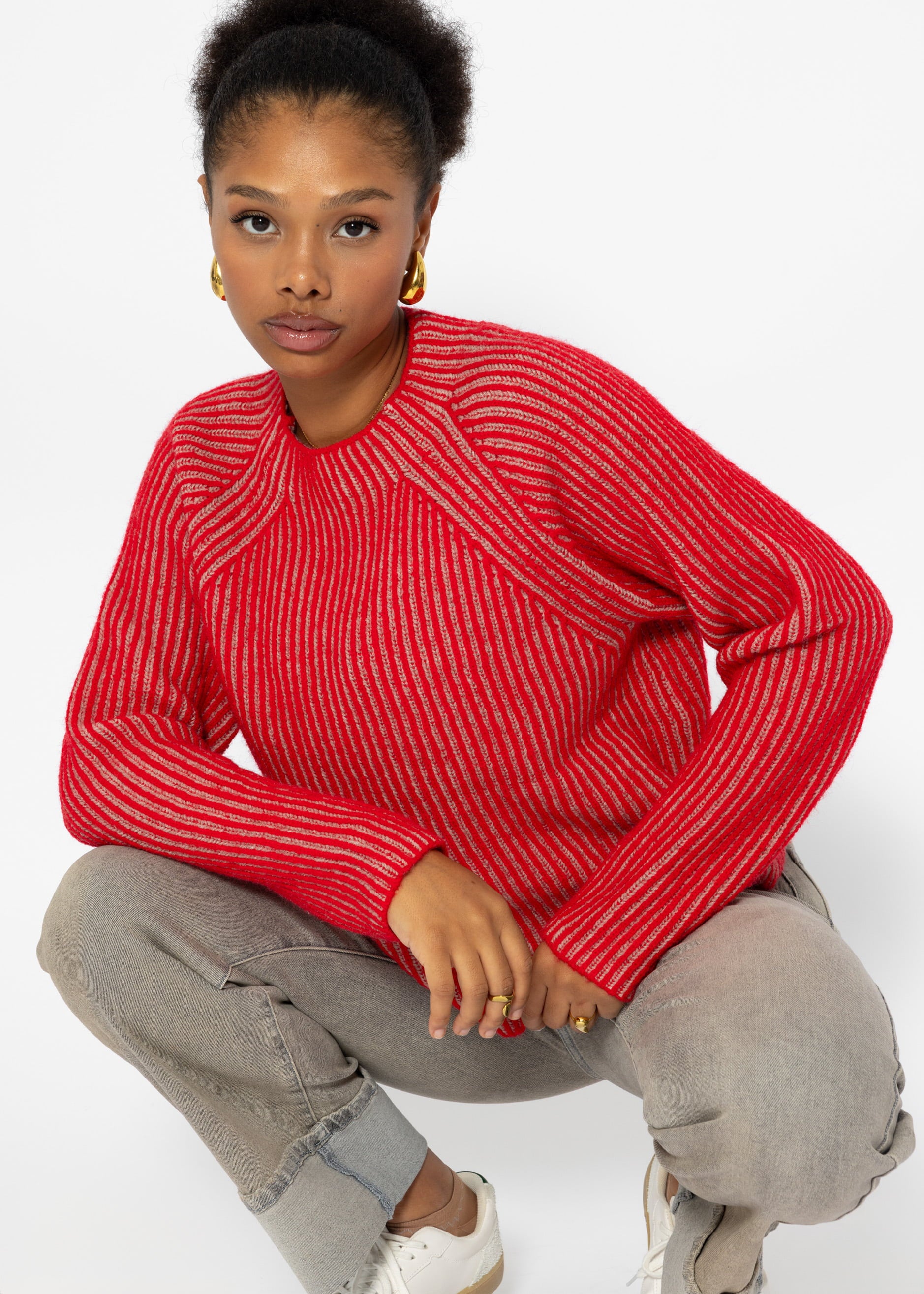Zweifarbiger gerippter Pullover - rot-beige